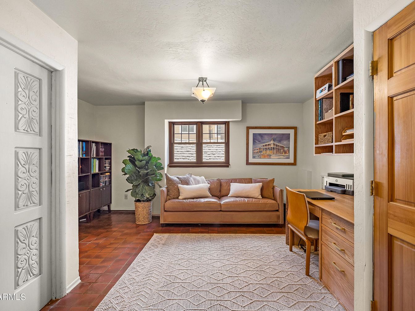 This cozy nook blends work and comfort perfectly with a warm, inviting color palette of natural wood tones and soft neutrals. A smooth leather sofa adorned with striped cushions sits beneath a framed architectural artwork, flanked by a wooden window frame that adds charm and allows natural light. To the right, a built-in wooden desk and shelving provide ample workspace, complemented by matching chair and printer. The textured, geometric-patterned rug softens terracotta tile flooring, while a lush potted plant adds a touch of greenery, making this area ideal for focused productivity in a stylish setting.