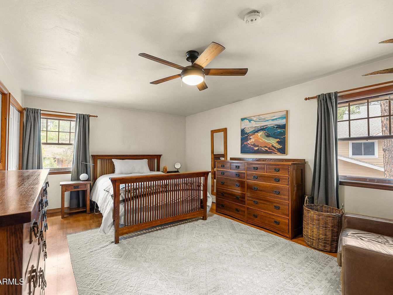 This spacious master bedroom features a calming neutral palette with white walls and warm wood tones. The centerpiece is a wooden slat bed frame that harmonizes with matching dressers and nightstands, creating a cohesive rustic aesthetic. Ample natural light flows from two large windows dressed in simple gray curtains, enhancing the airy feel. A textured, light-colored area rug anchors the space, complementing hardwood floors and wooden window trims. The ceiling boasts a modern wooden-blade fan with a light, contributing both style and comfort. Thoughtful details include a full-length mirror, an abstract landscape painting, and a woven basket adding subtle organic texture.
