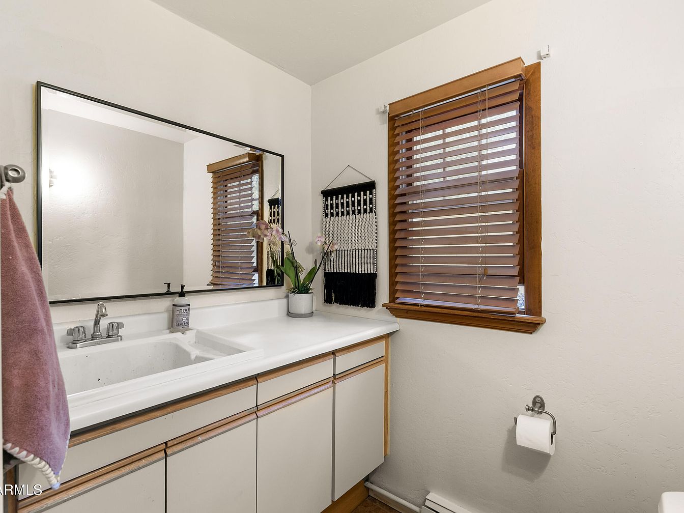 This bathroom vanity area features a clean, simple design with a white countertop and a built-in sink. Below the sink, cabinetry with muted tones framed in light wood offers storage space. A large rectangular mirror with a thin black frame stretches horizontally across the wall, creating a sense of openness and reflecting light from the adjacent window. The window, framed in medium wood, is dressed with horizontal wooden blinds for adjustable natural lighting and privacy. Subtle decorative touches include a small potted orchid, a hand towel in muted pink hanging nearby, and a woven black and white wall hanging adding texture.