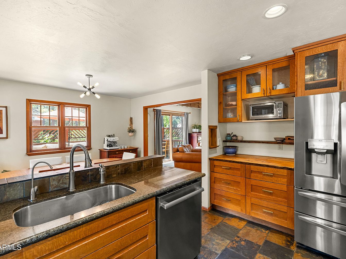 This kitchen features warm wooden cabinetry with a rich, natural finish complemented by a granite countertop with a subtle dark pattern. The slate tile flooring adds an earthy, rustic touch, harmonizing with the wood tones. Stainless steel appliances, including a refrigerator and dishwasher, bring a modern contrast. A single-basin undermount sink is centered in the large island-like counter, which also serves as a partial divider to the adjacent dining space. The dining area includes a window with wooden trim and a contemporary, starburst light fixture above a wooden table. Beyond the dining room, a cozy living space is visible, creating a seamless, open flow enhanced by natural light from the windows and glass doors. The overall aesthetic balances rustic warmth with contemporary functionality.