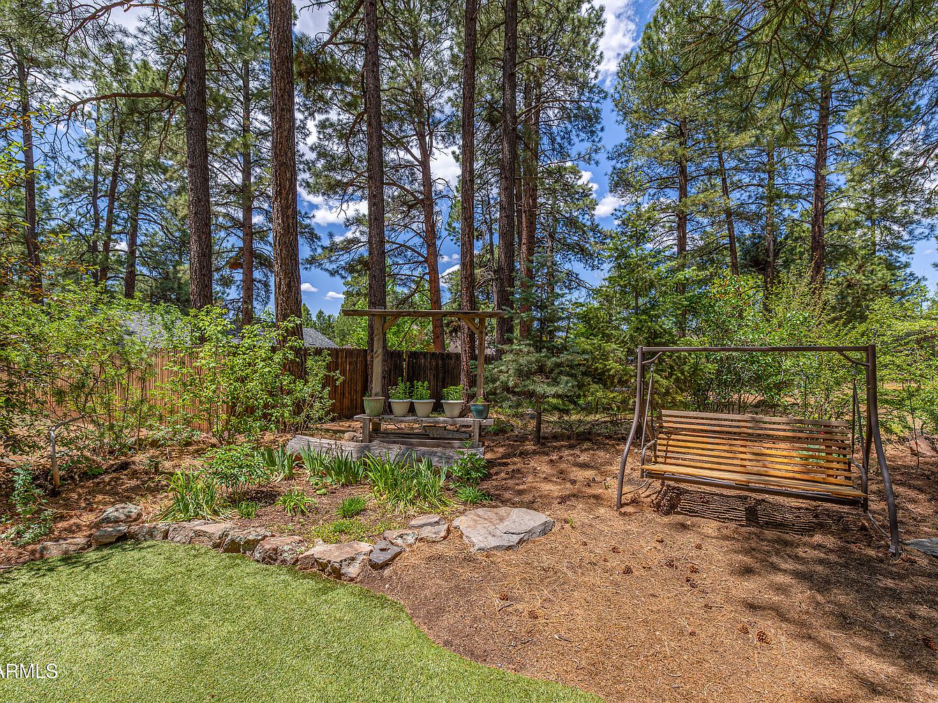 This serene backyard garden area features tall pine trees providing a natural canopy and a peaceful forest-like ambiance. A well-kept patch of green lawn softly curves along a stone-bordered flower bed filled with lush plants. A charming rustic wooden swing with a metal frame offers a cozy spot to relax and enjoy the tranquil surroundings. In the background, a wooden planter shelf holds multiple potted plants, adding to the natural, earthy aesthetic. The mix of rock, mulch, greenery, and wooden garden elements gives this outdoor space a calming, inviting vibe perfect for unwinding.