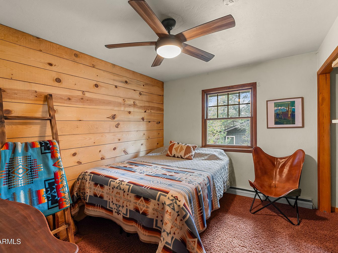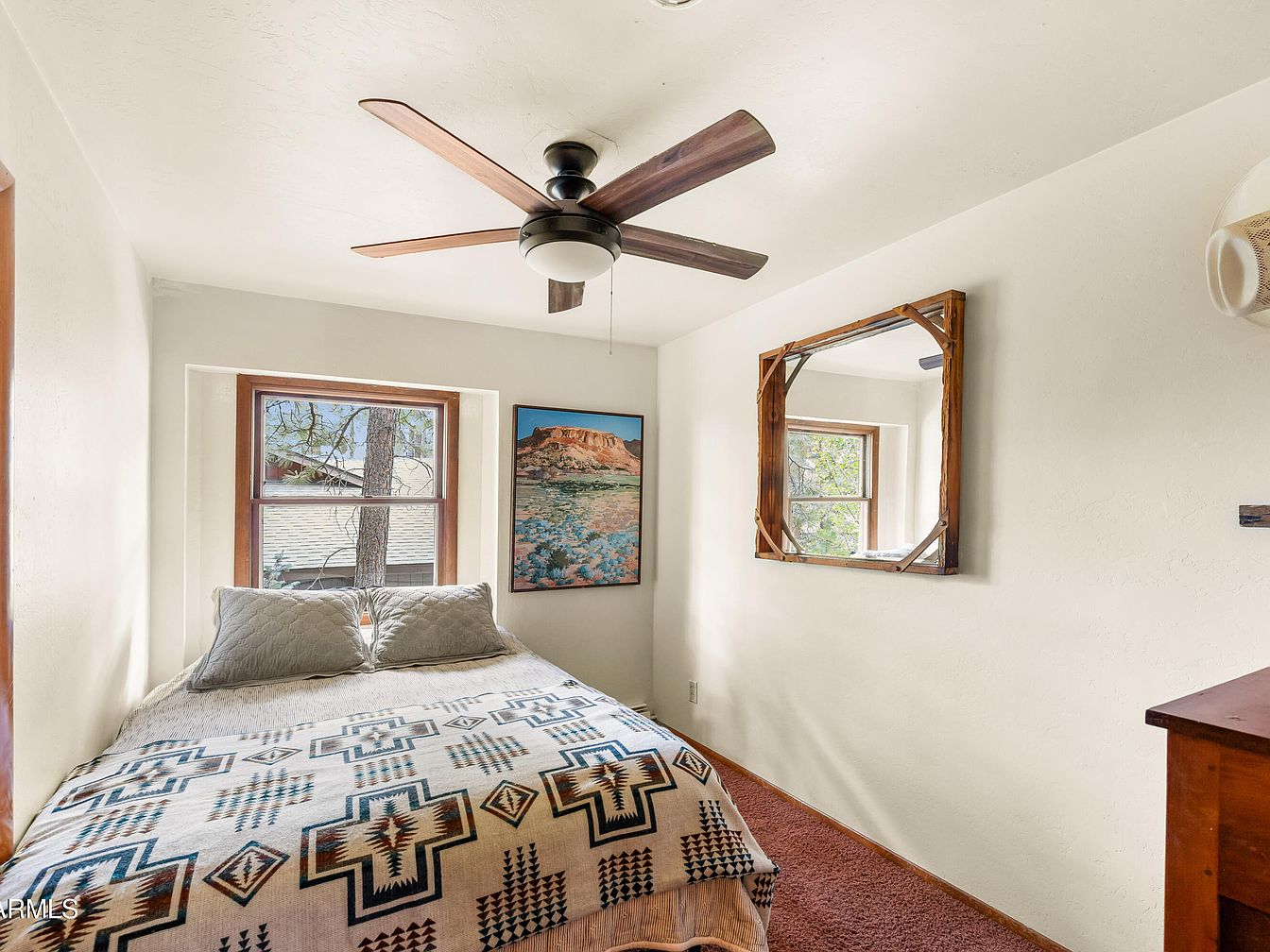 This compact bedroom offers a warm and inviting atmosphere with light cream walls that brighten the space. The bed, adorned with a patterned Aztec-inspired blanket in blue, brown, and cream tones, complements the rustic wood trim around the windows and baseboards. Two large pillows lean neatly against the wall beneath a window that allows natural light to filter in. A striking landscape painting hangs beside the window, enhancing the room’s earthy vibe. A wooden-framed mirror on the adjacent wall reflects the space, while a ceiling fan with dark wooden blades adds a functional yet stylish touch. Plush brown carpet anchors the space with warmth and comfort.