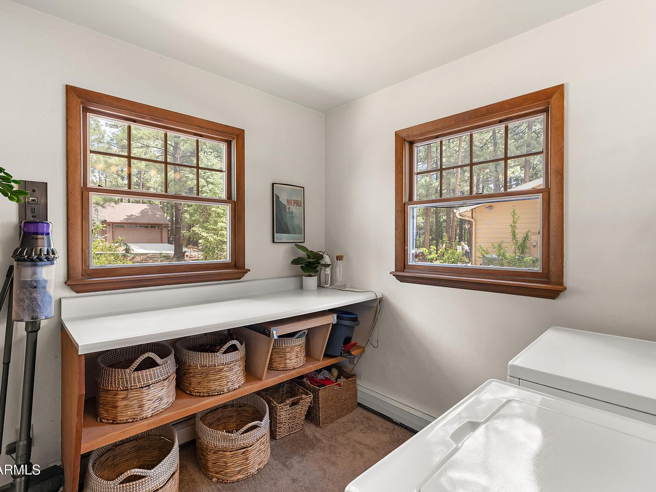 This laundry room offers a practical yet inviting space featuring two large windows with warm wooden trim that illuminate the room with natural light and offer views of verdant surroundings. A long white countertop provides ample surface area for folding or organizing laundry, complemented by multiple woven baskets neatly arranged on a wooden open-shelving unit beneath it, adding texture and rustic charm. Adjacent to the workspace, white appliances maintain a clean look, while a minimalist wall decoration adds a subtle touch of color without overwhelming the simple, efficient design. The soft, neutral wall color and carpeted floor create a cozy, welcoming atmosphere within this functional utility room.
