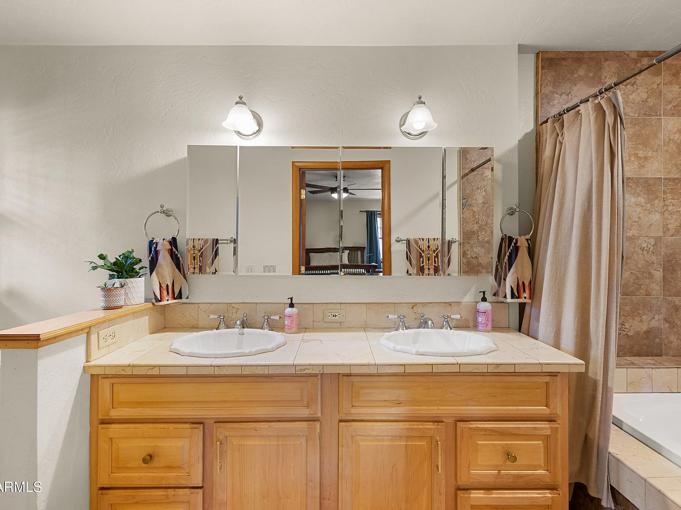 This bathroom features a double vanity with warm, honey-toned wooden cabinetry and a creamy beige tiled countertop that extends to a half wall. Above the sinks are three mirrored cabinets, offering ample storage and reflecting the adjacent room visible through a wood-trimmed doorway. Flanking the mirrors are two wall-mounted light fixtures with frosted glass shades, adding soft, ambient lighting. Beige stone tiles cover the surrounding bathtub walls, complemented by a neutral fabric shower curtain. Earthy tones and natural textures create a cozy, inviting aesthetic blending functionality with rustic charm.