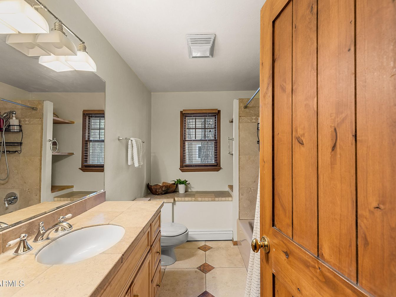 This bathroom offers a warm, rustic ambiance with natural wood elements and neutral tones. A wooden door opens into the space featuring a tiled floor with diamond-pattern accents. A large vanity with beige stone countertops houses a white sink and traditional silver fixtures. Above, a wide mirror is illuminated by a three-light fixture with frosted glass shades, adding soft lighting. The bathtub and shower area is tiled with a light, earthy stone complemented by built-in shelves and a shower curtain. Two windows with wood trim allow natural light and a view outside, while the room’s pale walls maintain an airy feel. Subtle greenery and a decorative wooden bowl add a touch of nature to the clean, functional layout.