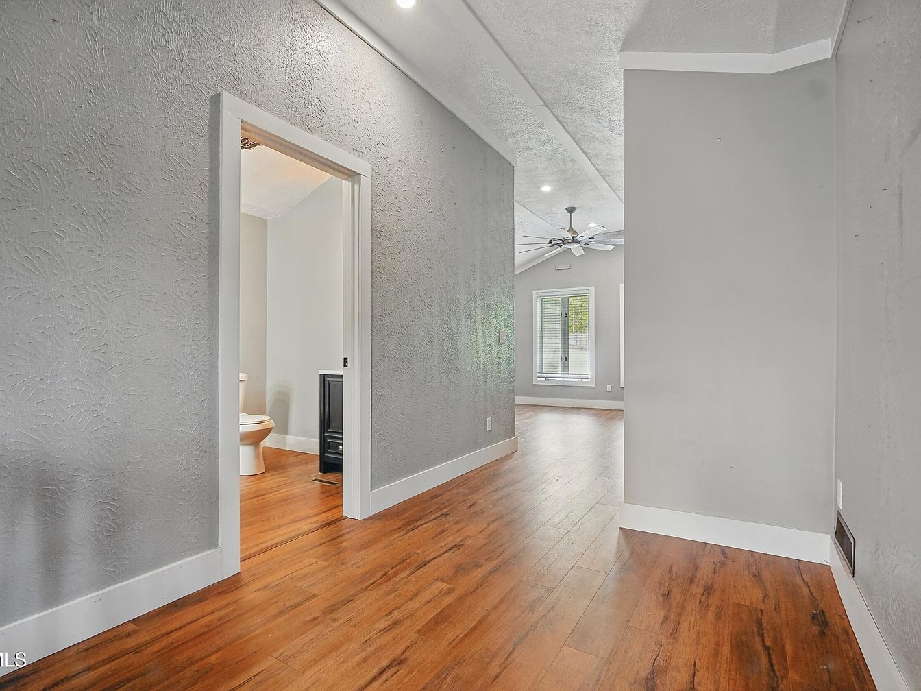 This hallway features warm wood-look flooring that contrasts gently with soft gray textured walls, giving a balanced blend of modern and cozy aesthetics. White trim outlines the open doorway leading to a bathroom, where a white toilet and a dark vanity cabinet subtly peek through. Further down the hall, the space opens up into a room with vaulted ceilings accentuated by a ceiling fan with large blades, recessed lighting, and a window framed in white, inviting natural light that brightens the muted tones and enhances the spacious feel of the home.