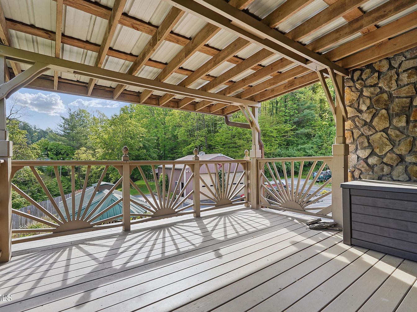 This inviting covered porch features natural wood flooring and matching wooden railings with sunburst patterns that create eye-catching shadows in the sunlight. A sturdy wooden beam framework supports a white roof, blending rustic charm with functional shelter. The stone wall on one side adds texture and warmth, complementing the natural surroundings visible beyond the porch. Lush green trees and a detached structure in the background create a serene, wooded backdrop. The space is ideal for quiet relaxation or entertaining, combining openness with cozy, natural materials and thoughtful design details.