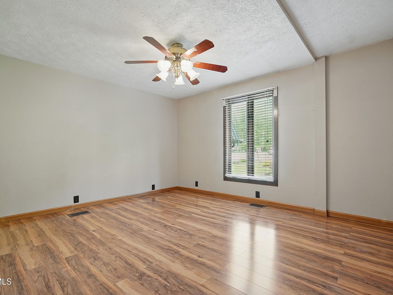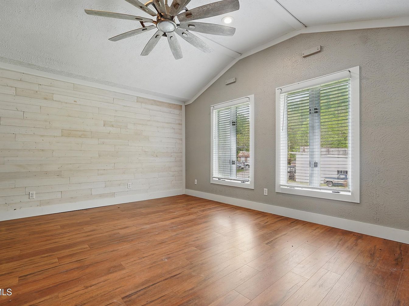 This bedroom corner showcases a serene and airy atmosphere highlighted by a vaulted ceiling with a large ceiling fan featuring multiple blades for optimal air circulation. The walls combine a textured light gray finish with an accent wall clad in pale whitewashed wood planks, adding rustic charm. Natural light floods the space through two sizable, symmetrically placed windows with white blinds, framed by crisp white trim. The warm wood-toned laminate flooring offers a cozy contrast, complementing the neutral palette and enhancing the overall tranquil and inviting vibe of this restful sanctuary.
