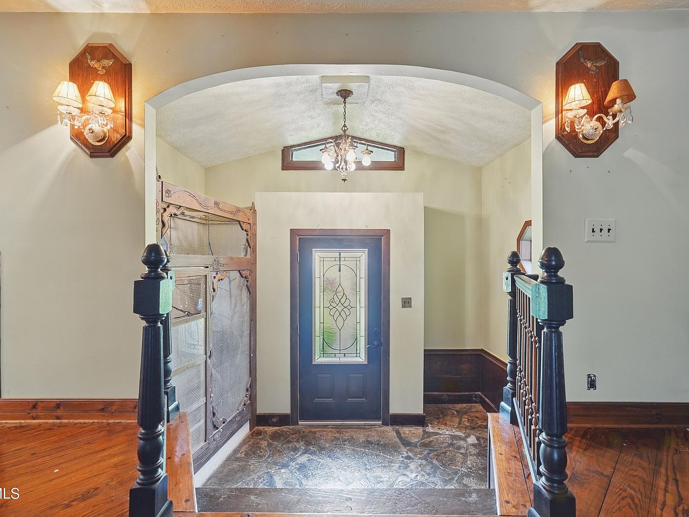 This entryway landing features a compact, sunken space with a dark wooden door adorned with artistic frosted glass. The flooring transitions to a textured stone tile, contrasting with the polished hardwood stairs leading down. Black wooden railings with decorative spindles flank the stairs, adding a traditional touch. Two matching wall sconces with warm lighting and small fabric lampshades highlight the cream walls, bringing a cozy ambiance. Above the door, a rectangular transom window allows additional natural light, complemented by an elegant chandelier hanging from the slightly vaulted ceiling, enhancing the classic yet inviting atmosphere.