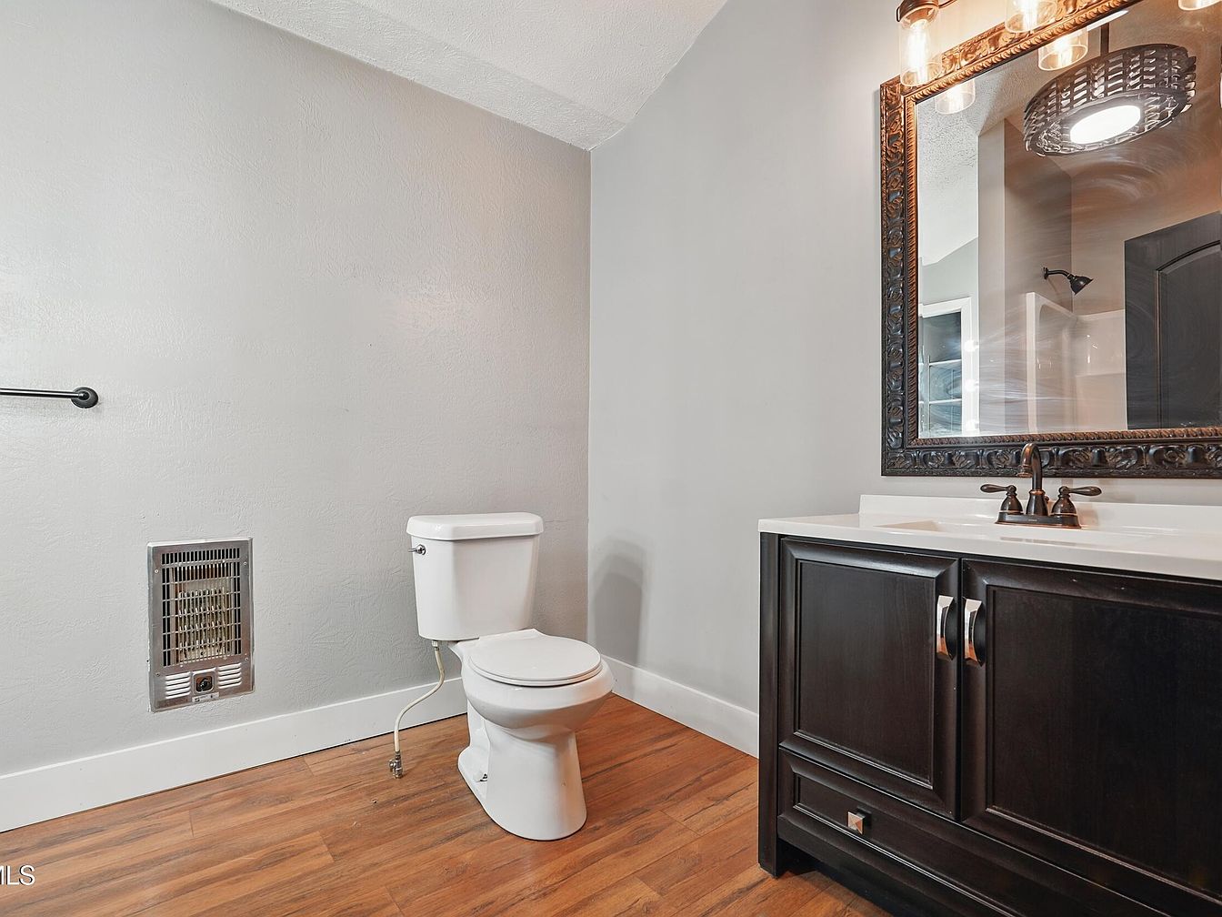 This bathroom features a clean, modern aesthetic with a simple layout. Light gray textured walls contrast softly against warm wood-toned flooring, creating a cozy yet contemporary atmosphere. A white toilet sits near the left corner, while to the right, a dark espresso-finished vanity with silver hardware supports a smooth white countertop. Above it hangs a large, ornately framed mirror which adds a touch of classic elegance. The bronze-finished faucet complements the mirror’s frame and the warm undertones of the wood floor, balancing modern simplicity with traditional charm.