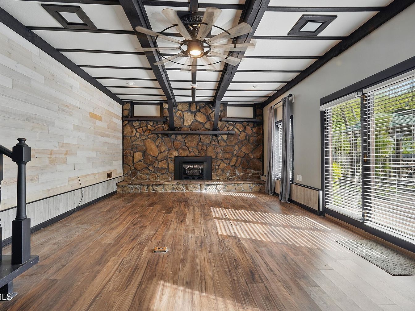 This living room boasts a rustic yet modern aesthetic, centered around a prominent stone fireplace framed by a raised hearth. The walls combine light wood paneling and muted gray paint, enhanced with black trim for a striking contrast. The ceiling features exposed dark wooden beams with white panels, adding architectural character. Natural light floods the space through large windows covered with white blinds and framed by elegant gray curtains. The warm wood-tone flooring complements the color scheme, while a large ceiling fan with wooden blades adds both style and function. This space is open, inviting, and balanced in texture and color.