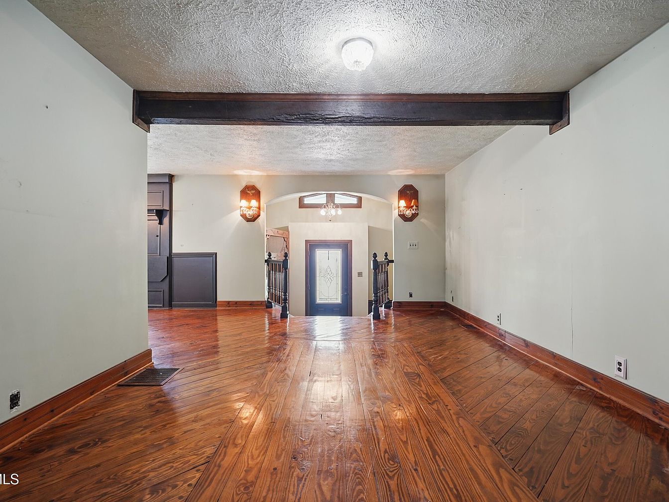 This inviting entry hallway features rich, warm hardwood floors that create a striking contrast against the soft neutral-toned walls. The floorboards are laid in a pattern that draws the eye towards the elegant front door with decorative glass detailing. On either side of the doorway, two wall sconces with amber lighting add a cozy, welcoming touch. Architectural details include a textured ceiling with a simple central light fixture and a prominent dark wooden beam that frames the passageway, enhancing the room’s rustic charm. The space opens up to other areas with wooden railings, suggesting a thoughtful flow throughout the home.