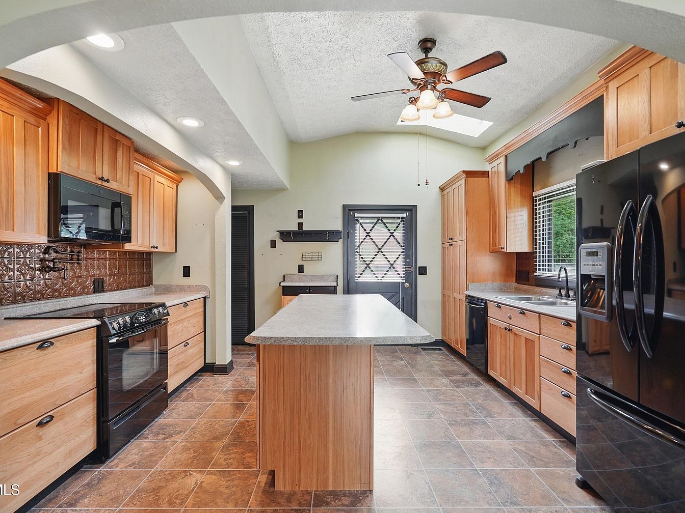 This spacious kitchen features a practical galley layout with an island at the center providing ample workspace. Warm wooden cabinetry runs along both sides, contrasting elegantly with the black appliances including a refrigerator, microwave, stove, and dishwasher. The backsplash is adorned with embossed, patterned tiles in a rich brown hue that complement the tile flooring in a similar earth tone. Above, a ceiling fan with lights adds functionality, while a skylight floods the space with daylight. The gray countertops provide a neutral tone balancing the warmth of the wood, and a back door with glass panes offers natural views and access to the outdoors.