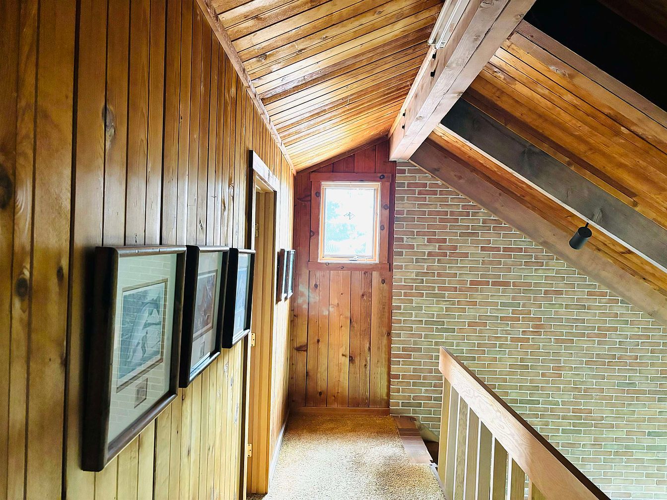 This cozy upper hallway features warm wood paneling on the walls and ceiling, enhancing a rustic yet inviting atmosphere. A small window at the end allows natural light to brighten the space. Exposed wooden beams angled across the ceiling add structural character and visual interest. The brick accent wall contrasts subtly with the wood, contributing texture and depth. Photographs framed in dark wood line one side, providing a personal touch. The neutral-toned carpet adds softness underfoot while complementing the natural wood hues, making this transition space feel homey and intimate.