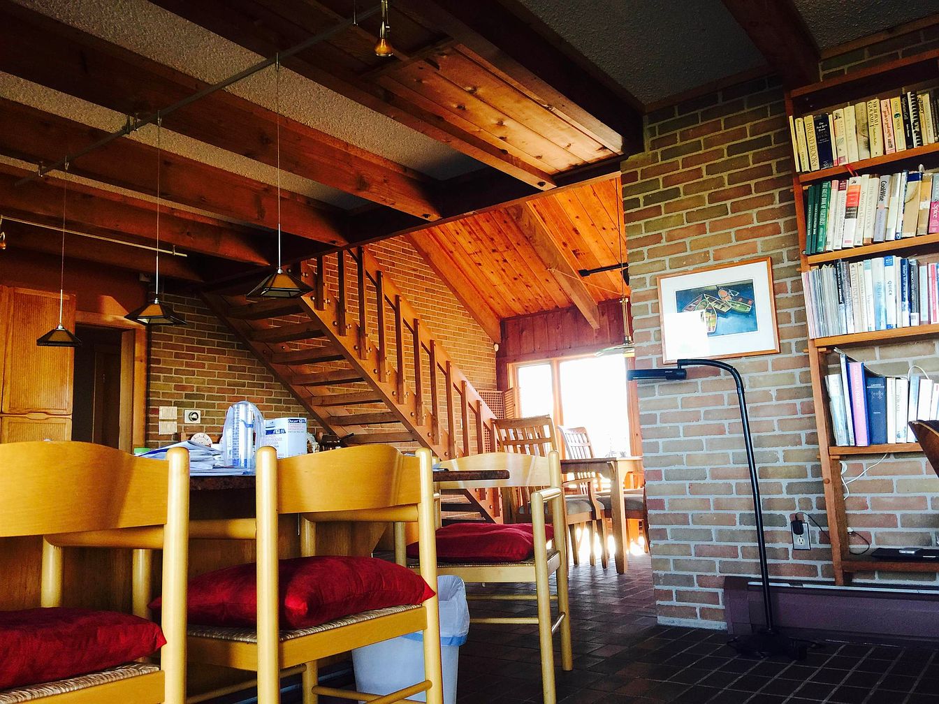 This warm, rustic dining space features light wood chairs with rich red cushions around a dark rectangular table, complementing the exposed wooden beams above. The room is defined by its brick walls and matching brick floor tiles, which lend an earthy, cozy atmosphere. A wooden staircase with simple vertical rails ascends alongside the back wall, coordinating with the wood-paneled vaulted ceiling in the adjacent area. Natural light floods in through large windows beyond the staircase, brightening a secondary sitting area. Built-in bookshelves filled with books and framed artwork add personality and charm to this inviting, multi-functional living space.