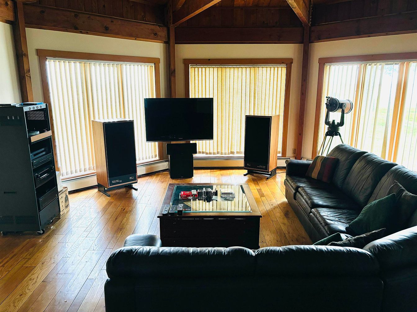 This media room features rich wooden flooring and exposed timber beams on the walls and ceiling, creating a warm rustic ambiance. Large vertical blinds cover three wide windows, filtering natural light to softly illuminate the space. A sizable black leather sectional sofa forms an inviting seating area, centered around a wood and glass coffee table holding remotes and media items. The entertainment setup includes a flat-screen television flanked by vintage wooden speakers and a black equipment rack filled with components. A brass telescope by the window adds a unique decorative touch, blending modern comfort with nostalgic charm.