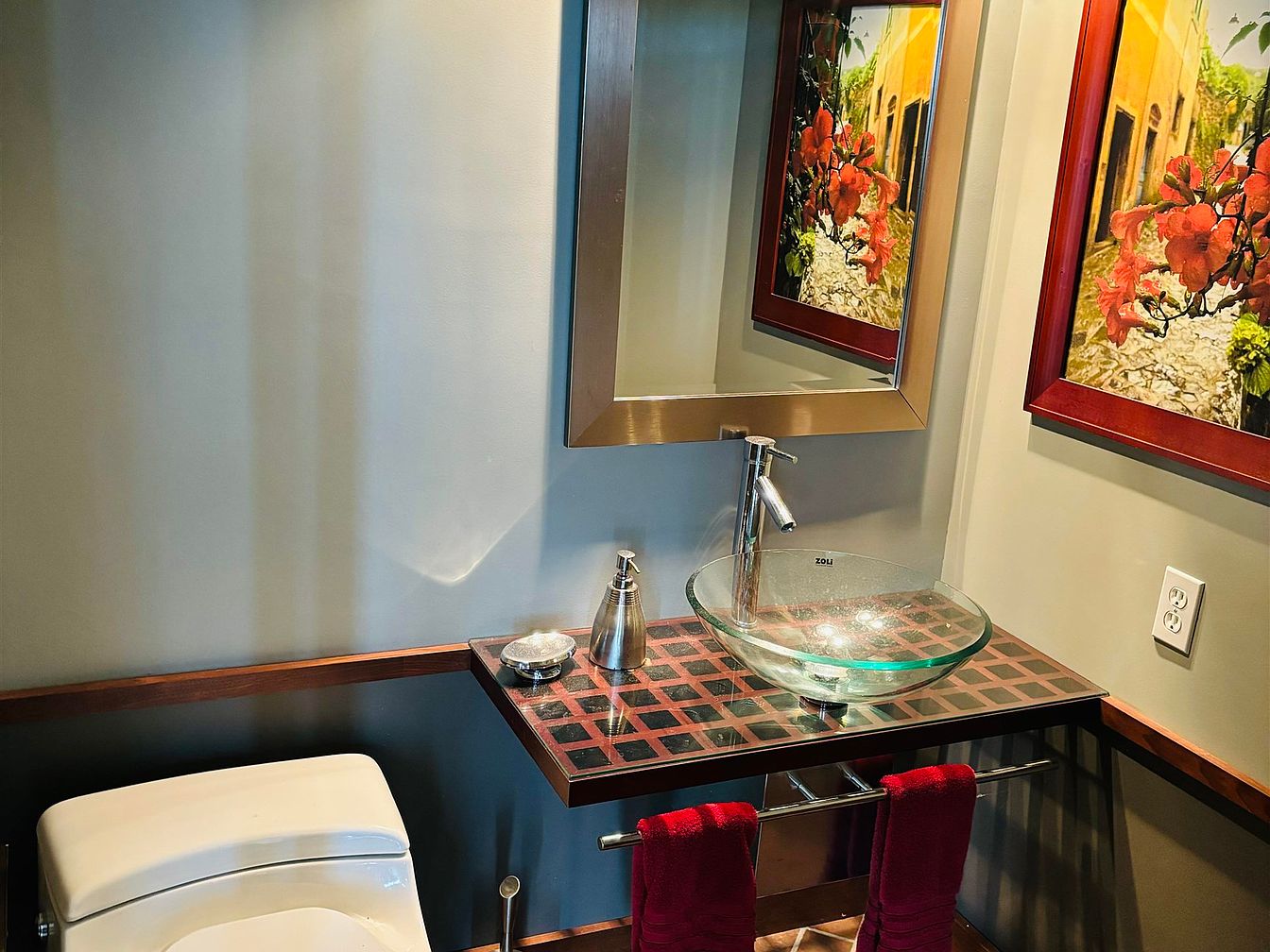 This compact powder room features a floating vanity with a striking glass vessel sink resting on a patterned countertop with red and black tiles. A sleek, modern faucet complements the sink’s transparent design. Above, a large metallic-framed mirror enhances the sense of space. The walls are painted a soft gray, paired with dark wood trim lining the lower half of the walls, adding warmth and contrast. Red hand towels hang neatly from a polished metal bar beneath the vanity. The space is accented by vibrant artwork with warm tones, balancing the cool grays and metallic finishes.