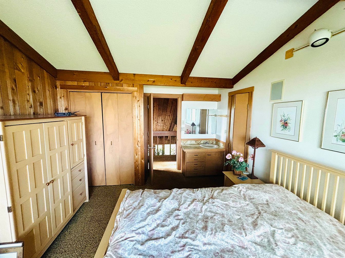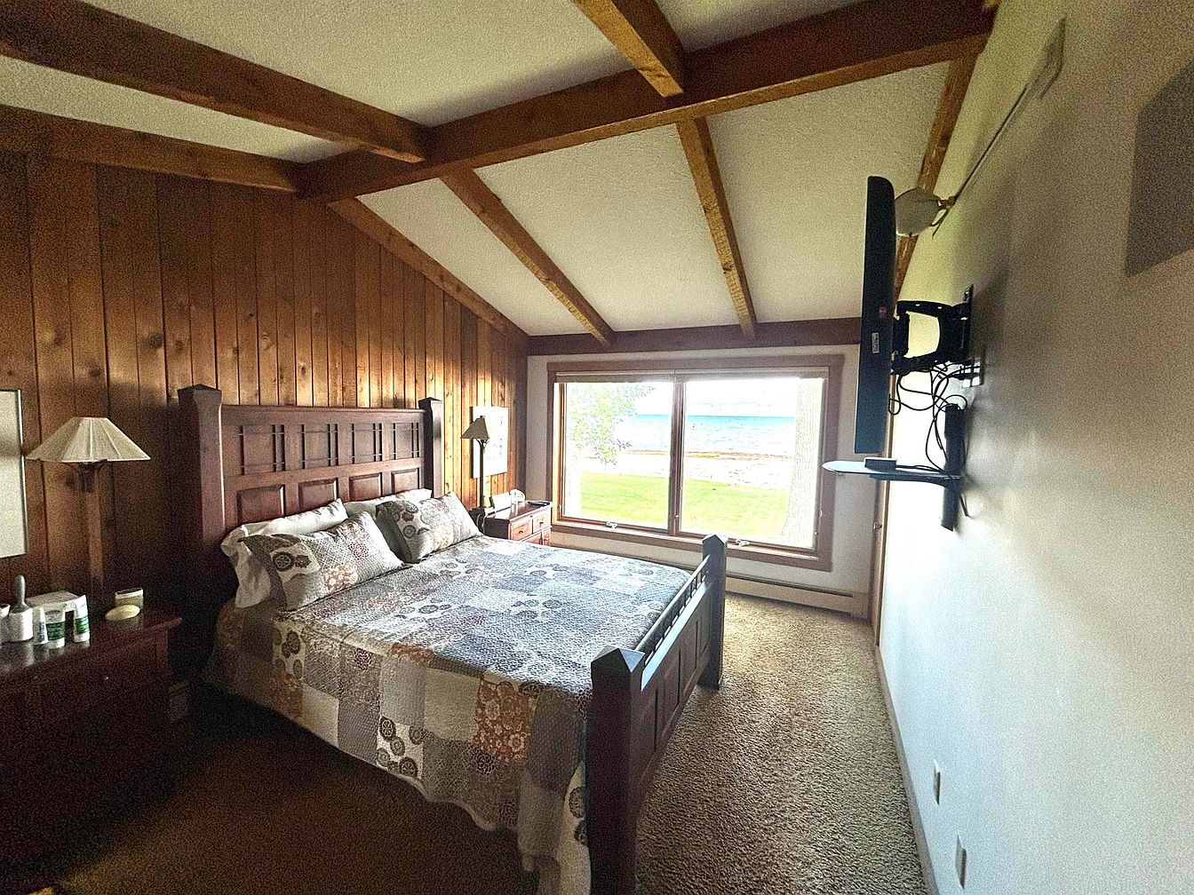 This intimate bedroom features warm wood-paneled walls and exposed ceiling beams that add rustic charm. A large window offers serene waterfront views, flooding the space with natural light and making the room feel connected to nature. The bed, with a dark wooden frame, is dressed in a cozy patchwork quilt in muted earthy tones, complementing the wooden furnishings. Carpeted flooring adds softness underfoot, contributing to the inviting atmosphere. Mounted on the plain white wall opposite the bed is a flat screen TV, allowing for entertainment without interrupting the room’s natural aesthetic balance.