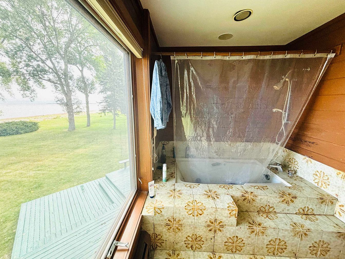 This cozy bathroom features a sunken bathtub surrounded by vintage floral-patterned tiles in beige and yellow tones, creating a warm, nostalgic ambiance. The tub is enclosed by wooden walls painted a deep brown, enhancing the rustic charm. A clear plastic shower curtain hangs above the tub, offering practical water protection. A large window beside the tub floods the space with natural light and provides an expansive view of the green lawn and trees outside, connecting the indoors with the serene outdoors. Simple fixtures and minimal décor emphasize comfort and relaxation in this unique bathroom.