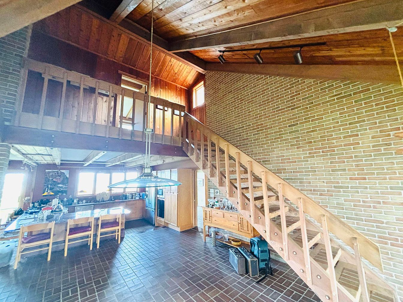 This spacious area features an open-concept kitchen seamlessly integrated with a staircase leading to an upper loft or second floor. The warm, earthy tones dominate the space, with exposed wooden beams on the ceiling and a wooden staircase railing complementing the rich brick wall backdrop. The flooring consists of dark, rectangular tiles arranged in a grid pattern, enhancing the rustic yet cozy atmosphere. The kitchen is equipped with wooden cabinetry and a long counter island with several wooden chairs aligned for casual dining or socializing. Natural light filters through large windows, brightening the space and highlighting the harmonious blend of brick, wood, and tile materials.