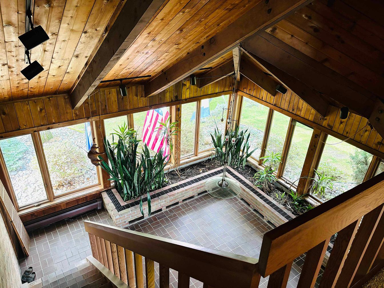This bright sunroom stairwell connects an upper level with a spacious lower area. The design features expansive floor-to-ceiling windows that flood the space with natural light and offer clear outdoor views. Wood paneling covers the slanted ceiling and walls, warm in tone, creating a cozy, rustic atmosphere. The floor is tiled in muted brown shades that complement the wood tones. Built-in raised brick planters with dark tile trim line the perimeter, showcasing lush green plants that add life and vibrancy. A glass pendant light hangs centrally, enhancing the natural aesthetic while maintaining a simple, functional look.