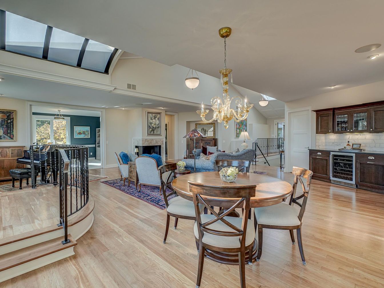 The dining area showcases a round wooden table surrounded by four elegant chairs, each featuring a cross-back design. Above, a stunning chandelier with delicate glass accents casts a warm glow. The space seamlessly flows into an inviting living area, marked by a plush blue sofa and classic armchairs accentuated by soft cushions. Light hardwood floors enhance the openness of the room, while a large, patterned rug adds texture beneath the dining set. Natural light pours in through large windows and a skylight, complementing the neutral color palette, accented with touches of blue and brown throughout.