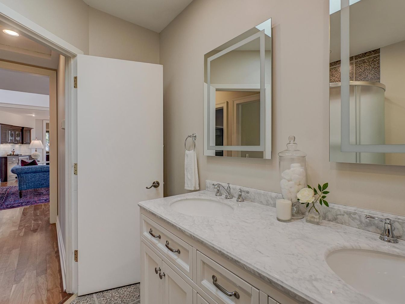 The bathroom features a dual sink vanity with a pristine white marble countertop that reflects a modern and luxurious aesthetic. Two rectangular mirrors above each sink, framed in sleek silver, add depth and brightness. The cabinetry is a clean white, enhancing the airy feel of the space. Subtle beige walls complement the fixtures, creating a warm but fresh atmosphere. A glass jar filled with cotton balls and a single white rose adds a touch of elegance. The distant view hints at a cozy living area through an open door, offering a seamless flow between spaces.