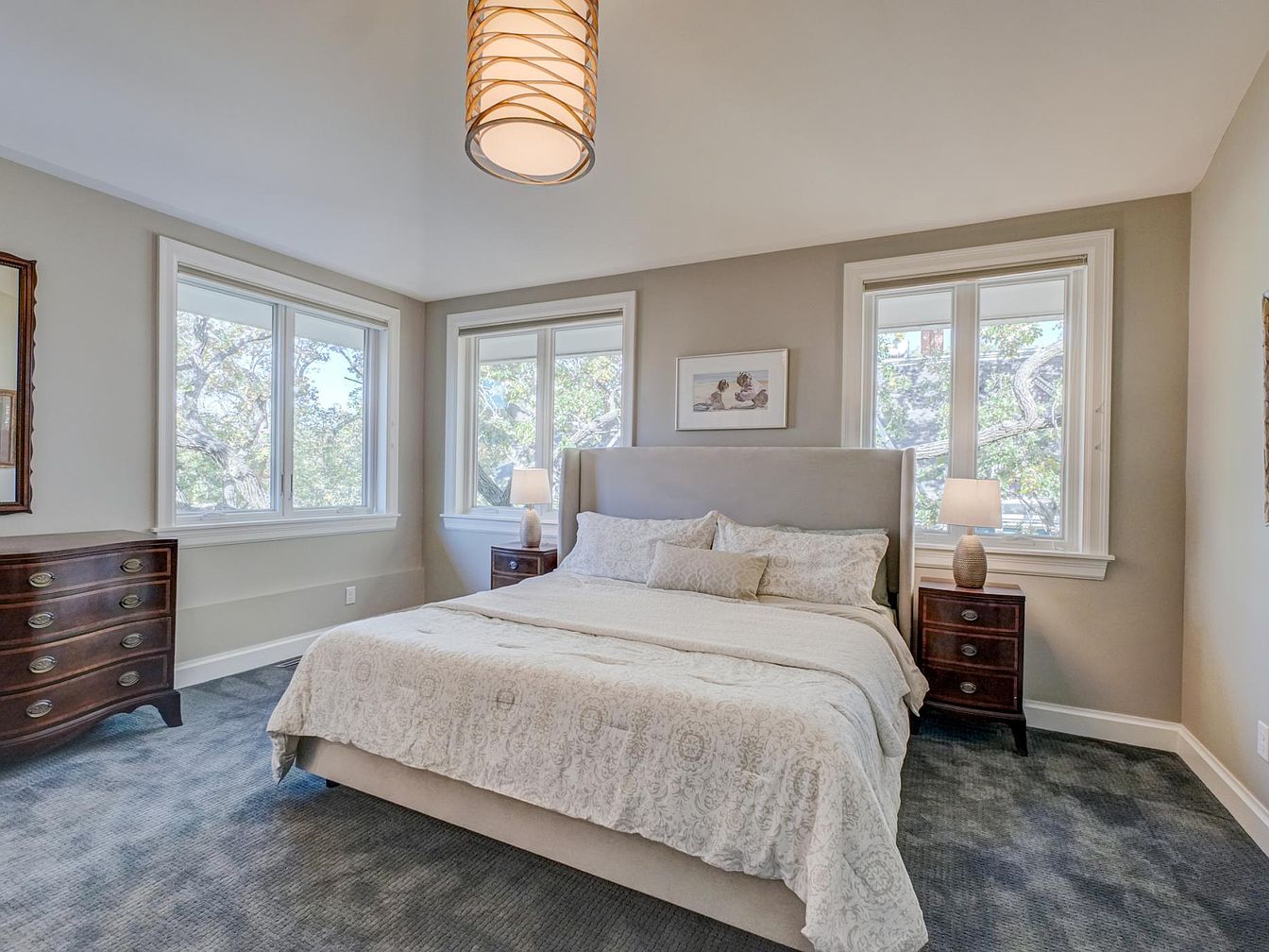 This bedroom features a calming, neutral color palette with soft beige walls and a plush gray carpet. Natural light floods in through large windows on two walls, enhancing the airy feeling of the space. A prominent bed with a plush, upholstered headboard sits centrally, adorned with textured white bedding and decorative pillows, creating a cozy focal point. Flanking the bed are two stylish bedside tables with modern lamps, providing warm lighting and functional space for personal items. A vintage-style dresser adds a touch of elegance, complementing the overall serene and inviting atmosphere of the room.