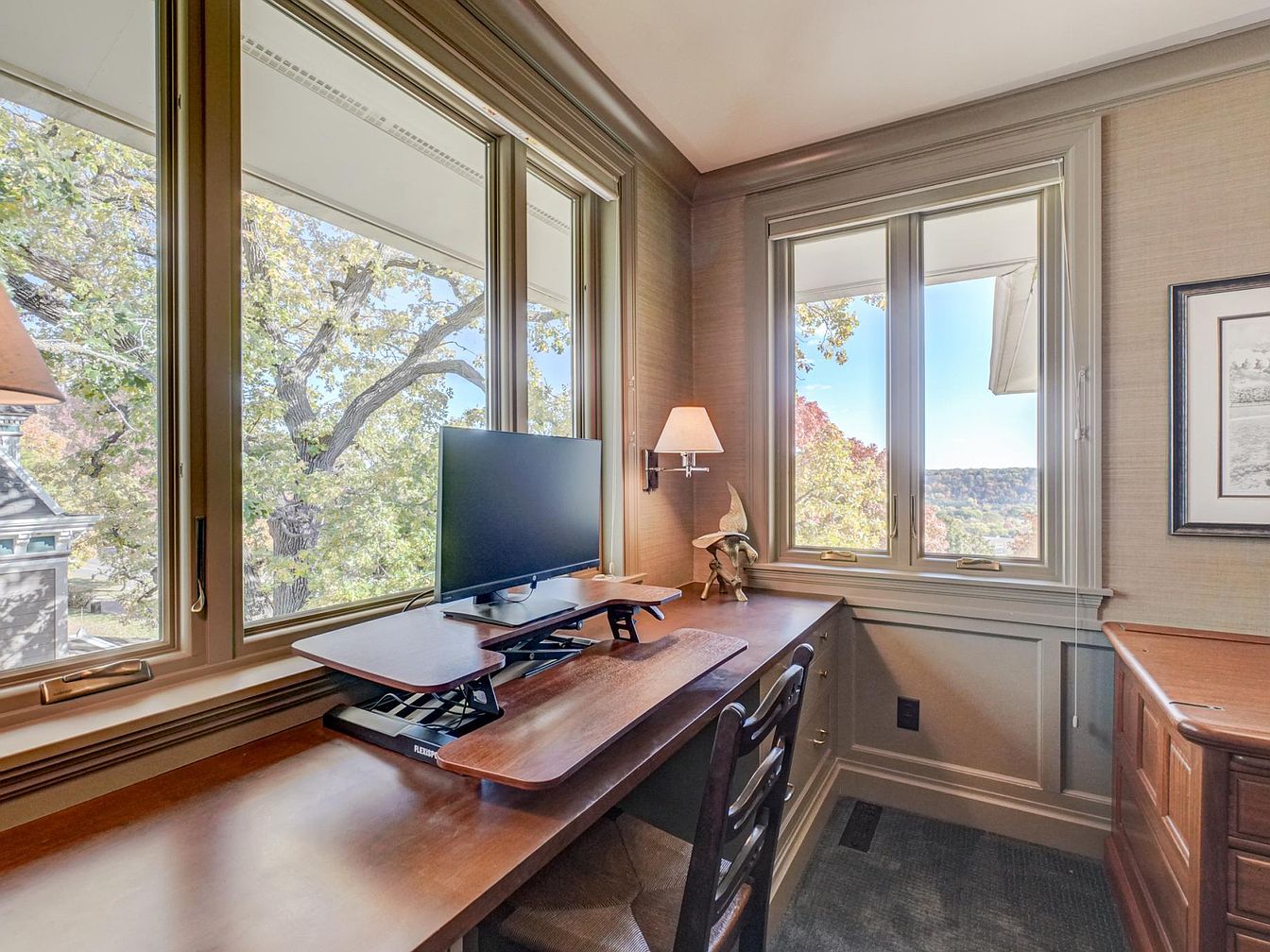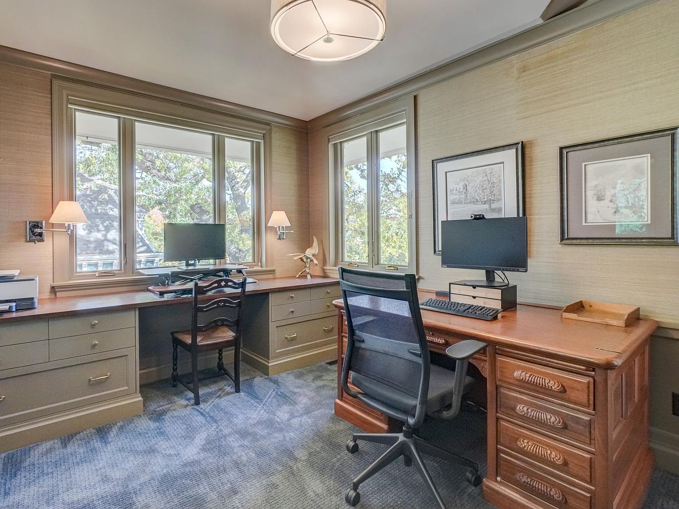 This home office features large windows that fill the space with natural light, offering a picturesque view of the vibrant outdoors. The room showcases a warm, neutral color scheme with soft beige walls and rich wood accents. A sleek wooden desk provides ample workspace, accompanied by a monitor on a stylish stand for ergonomic comfort. A cozy wall sconce adds ambient lighting, while a decorative figurine sits nearby, enhancing personal touches. Architectural details like crown molding and wainscoting bring an elegant touch, perfectly marrying functionality with classic aesthetics in this serene workspace.