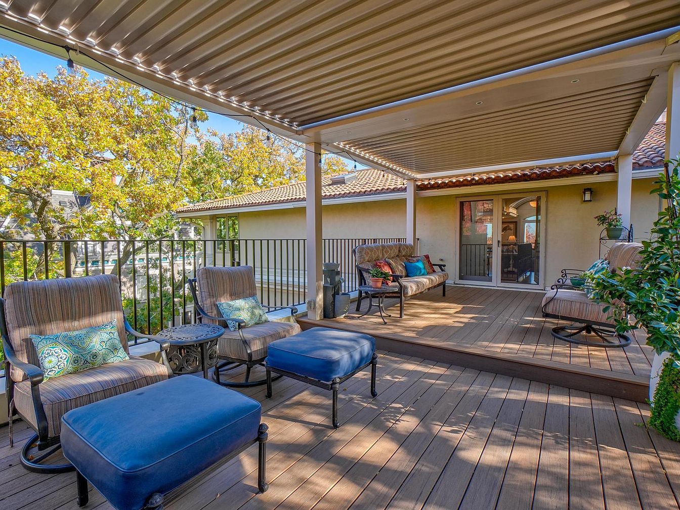 An inviting patio features a warm wooden deck adorned with comfortable seating arrangements. Two plush armchairs with subtle striped upholstery are complemented by vibrant decorative pillows, adding a splash of color. A low table with intricate metalwork serves as a focal point, perfect for drinks or relaxation. Beyond, a sectional couch extends comfort, draped in rich fabric and complemented with more pillows. A sleek overhead cover provides shade while allowing natural light through, enhancing the warmth of the yellow stucco walls. Framed by lush greenery, the space seamlessly blends indoor comforts with outdoor serenity, ideal for gatherings and tranquility.