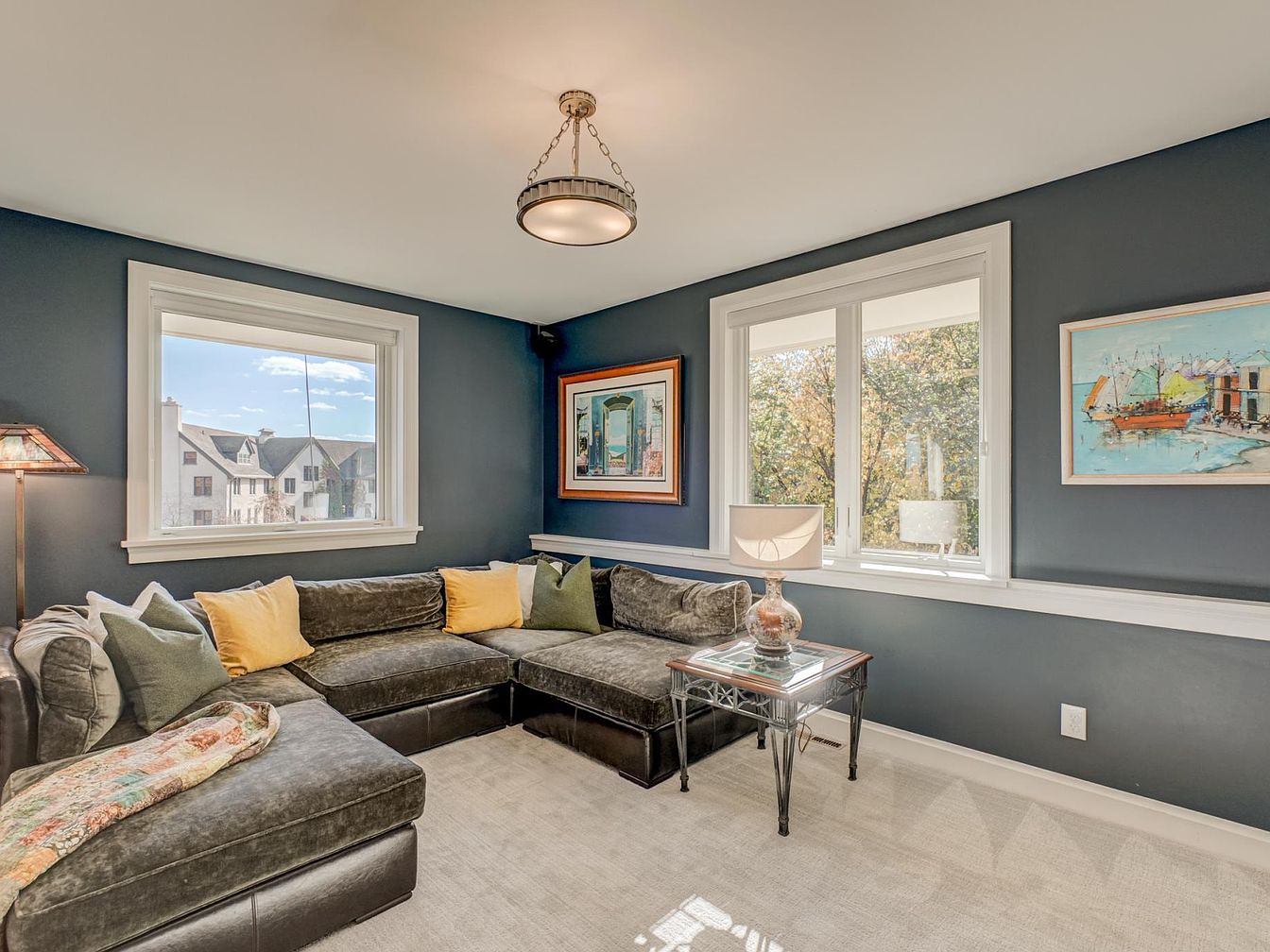 This image shows a cozy seating area designed for relaxation. A large, dark gray sectional couch dominates the space, complemented by a variety of decorative pillows in muted greens and yellows. Dark blue walls enhance the warm ambiance, while two medium-sized windows allow natural light to filter in, revealing glimpses of the outdoors. A framed artwork adorns one wall, introducing color and interest. A glass-top side table with an antique finish sits next to the couch, softly illuminated by a stylish lamp. The plush carpet underfoot adds comfort and warmth to the inviting atmosphere.