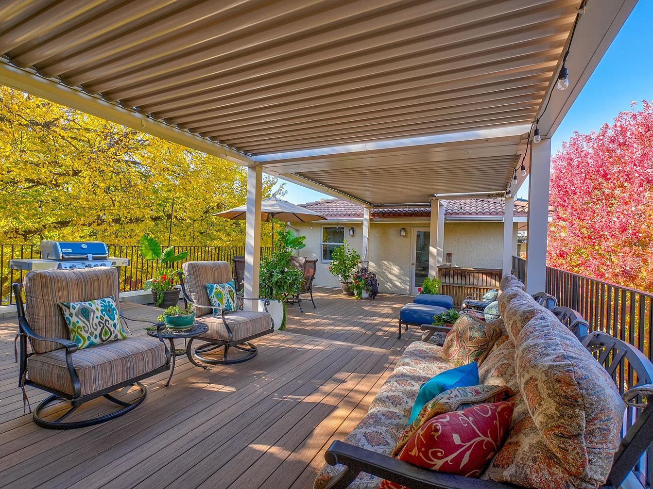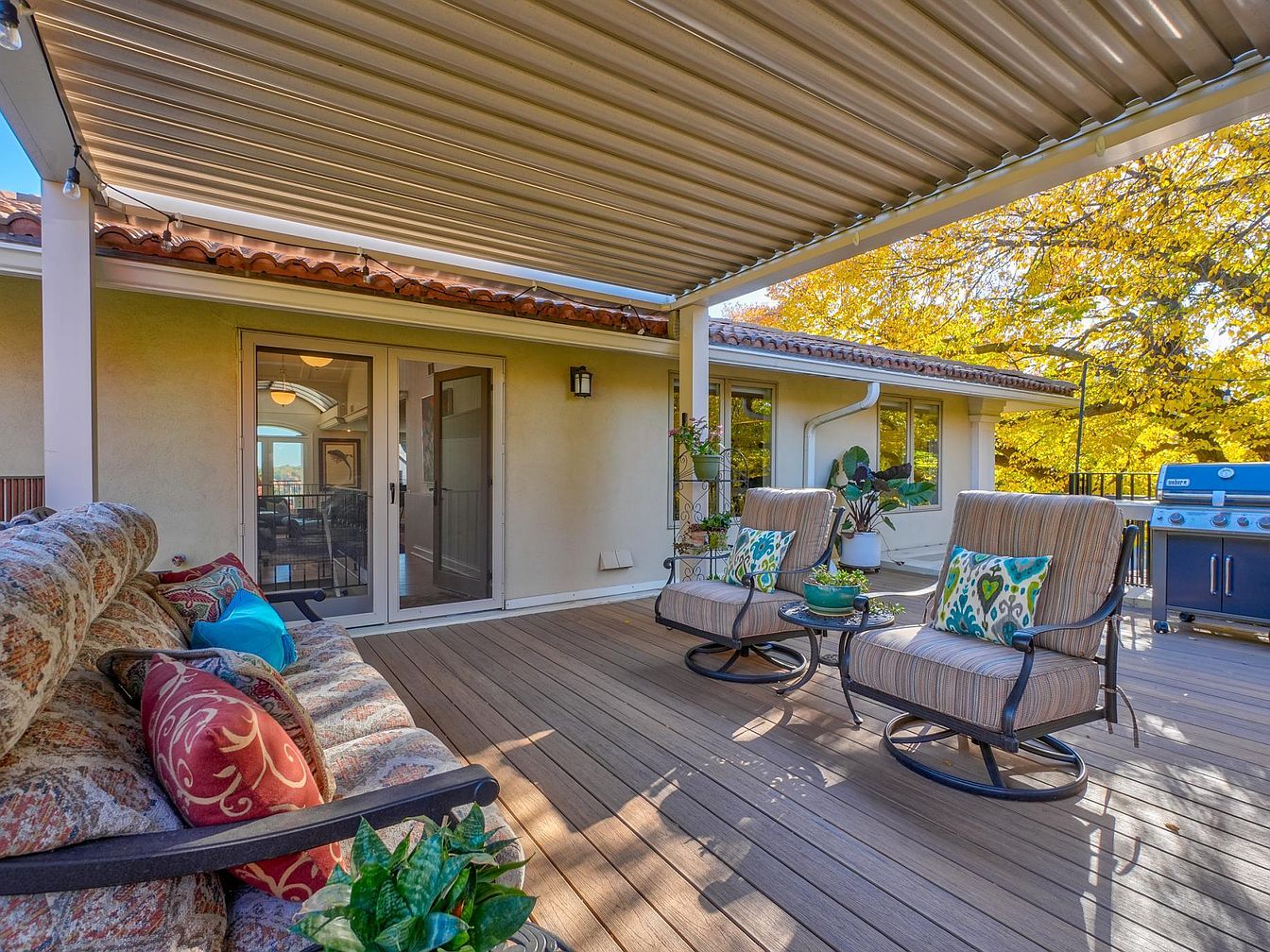 An inviting patio space showcases comfortable seating with plush cushions, featuring vibrant throw pillows in intricate patterns. The wooden deck exudes a warm, natural tone, enhancing the relaxed ambiance. A covered awning provides shade, allowing for all-weather enjoyment. Adjacent to the seating area, a sleek grill stands ready for outdoor cooking. Lush potted plants add greenery, while large windows of the home offer glimpses of interior elegance. Sunlight filters through, creating a cozy atmosphere. The backdrop of autumn foliage introduces rich yellows and oranges, complementing the earth tones of the decor for a harmonious outdoor retreat.
