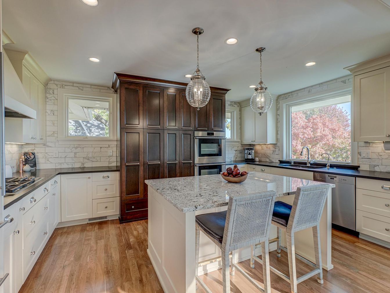 A modern kitchen showcasing a blend of functionality and style. The room features white cabinetry paired with rich dark wood elements, including a statement pantry. Sleek granite countertops in light hues create a spacious island, complemented by stylish barstools. Light fixtures add a subtle elegance, while a large window offers a panoramic view of vibrant fall foliage, enhancing the space with natural light. The back wall showcases marble-tiled splashes that contrast beautifully with the cabinetry, creating an inviting atmosphere. Practical stainless-steel appliances are seamlessly integrated, making this kitchen both attractive and highly functional.