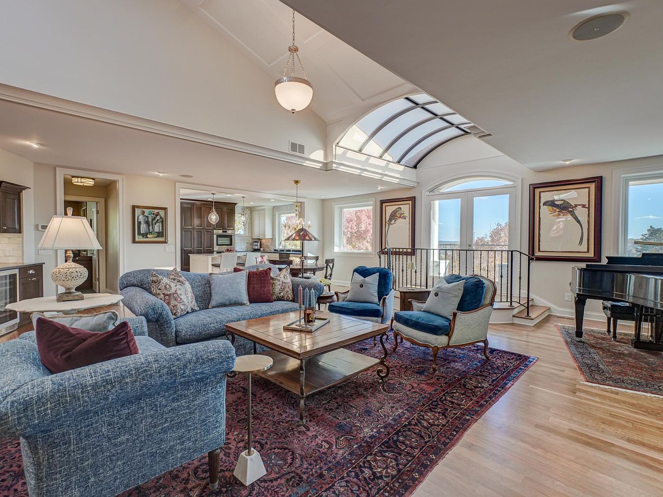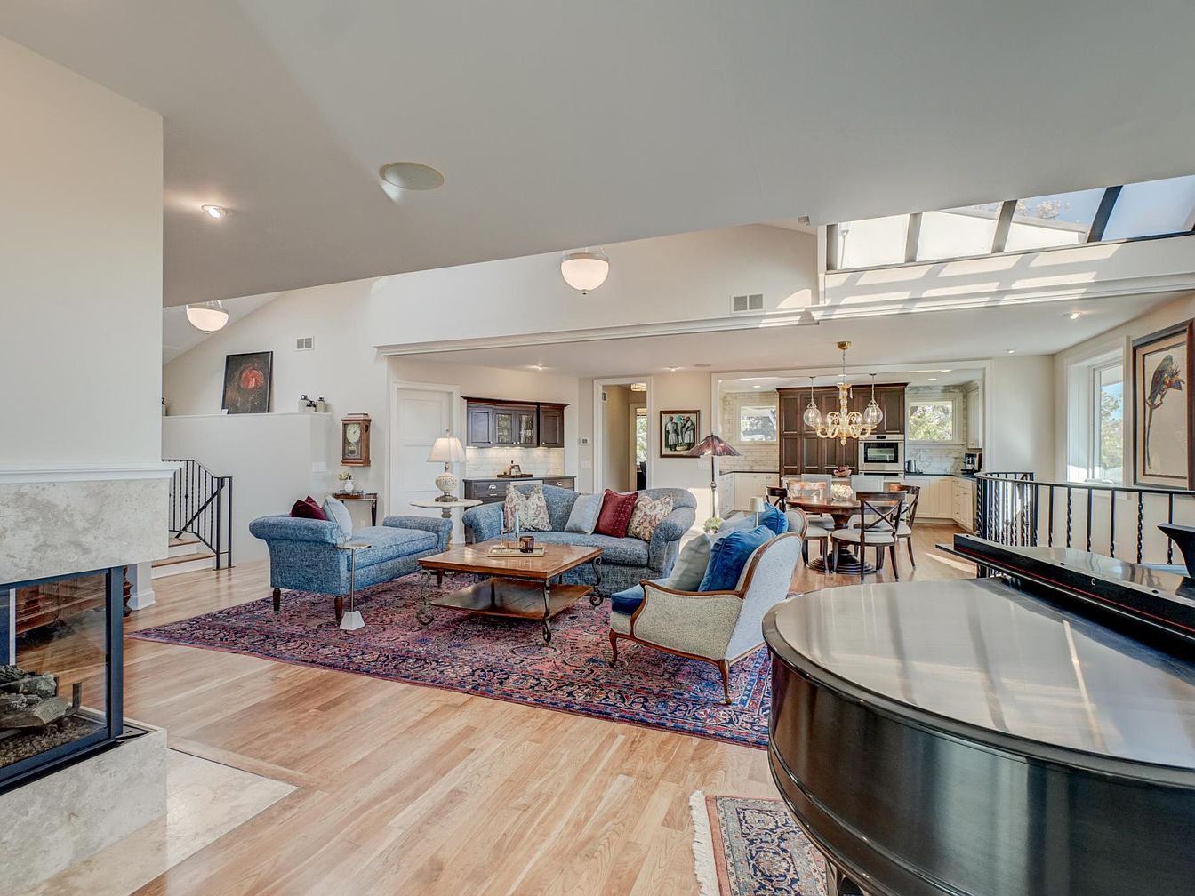 An expansive living room features a blend of classic and contemporary design. Rich hardwood floors add warmth, complemented by a large Persian rug. Plush blue sofas with decorative pillows create a cozy seating arrangement, while a refined coffee table sits at the center. A grand piano with a glossy finish rests nearby, enhancing the elegant atmosphere. In the background, light-colored walls and ample windows allow natural light to flow, highlighting the open layout toward the dining area. Modern lighting fixtures, including a chandelier, add sophistication, making this space perfect for both relaxation and entertaining.