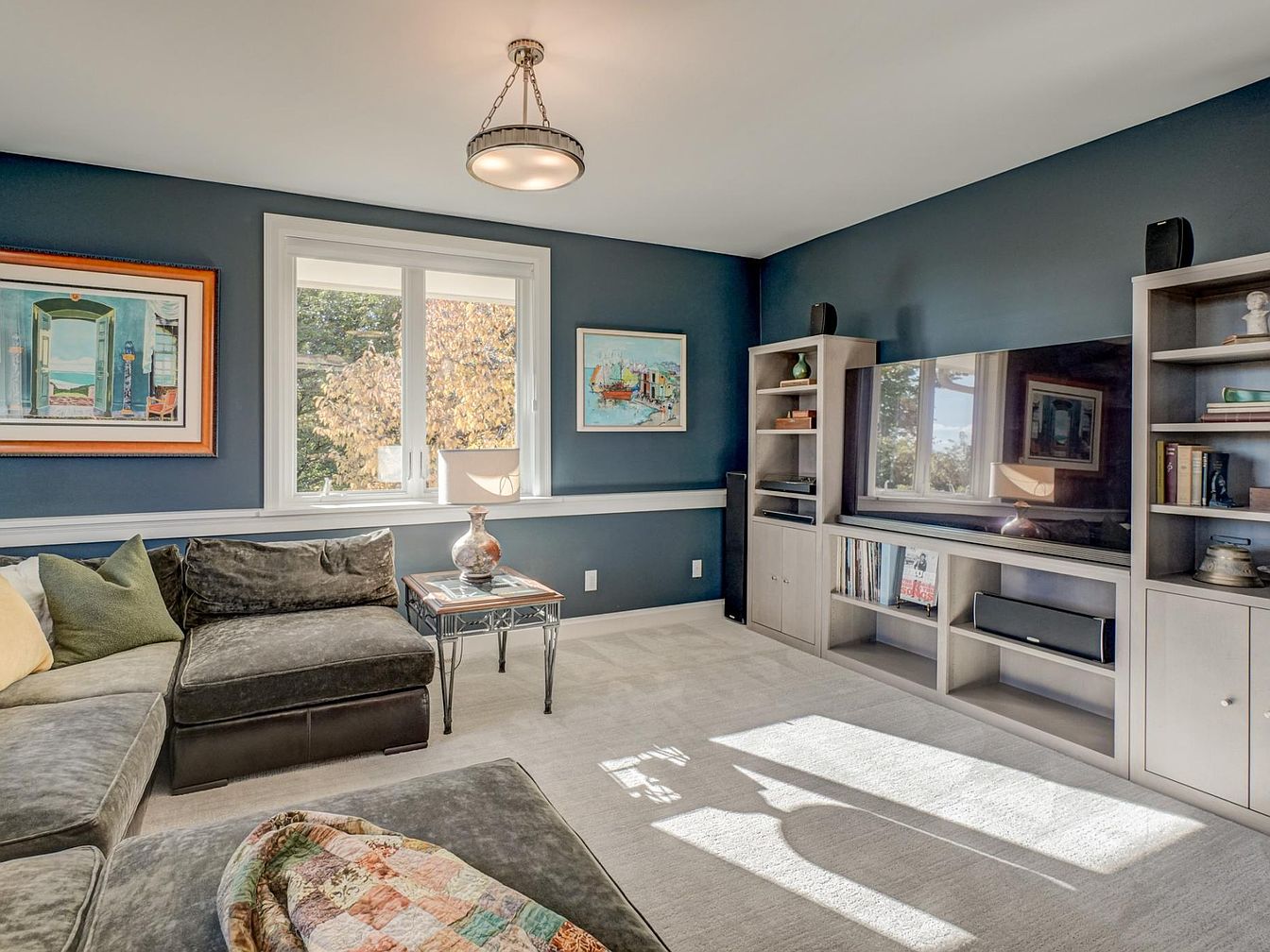 This cozy living room features a deep blue accent wall, enhancing its modern aesthetic. A plush, dark gray sectional wraps around the space, complemented by colorful throw pillows. A small glass-topped side table hosts a decorative vase, adding a touch of elegance. An entertainment unit made of light wood anchors one wall, holding a large flat-screen TV and showcasing books and decor. Natural light floods through large windows, bordered by crisp white trim. Art pieces in vibrant colors adorn the walls, bringing life to the room, while a soft carpet underfoot adds warmth and comfort.