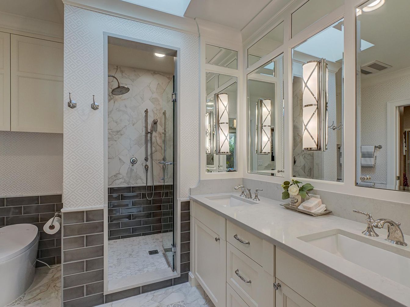 This sophisticated bathroom features a spacious double vanity with a creamy white countertop and polished chrome faucets. Above, large mirrors reflect light and enhance the openness of the space. The shower area showcases elegant marble tiling, complemented by a glass enclosure, transforming it into a luxurious focal point. A textured geometric wallpaper adds subtle depth to the walls, contrasting with the dark, sleek lower tiles. Modern pendant lighting fixtures provide soft illumination, accentuating the bathroom’s clean lines and contemporary aesthetic. An arrangement of toiletries on the countertop adds a touch of warmth and organization.