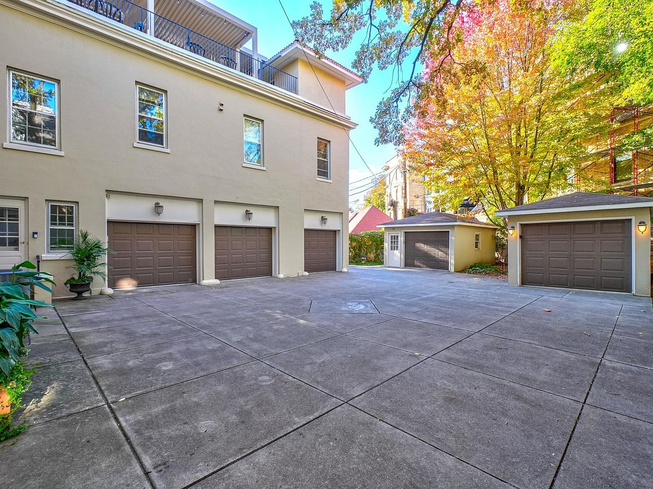 The spacious garage area features a smooth concrete surface, accommodating several vehicles with ease. The exterior walls are painted a soft beige, providing a warm backdrop that contrasts with the brown, paneled garage doors. Above the garages, large windows enhance natural light, reflecting the surrounding foliage. Lush green plants in pots add a touch of vibrancy, while mature trees with colorful autumn leaves contribute to the serene atmosphere. The layout is practical yet aesthetically pleasing, blending functionality with a hint of charm, and creating an inviting entrance to this historic home.