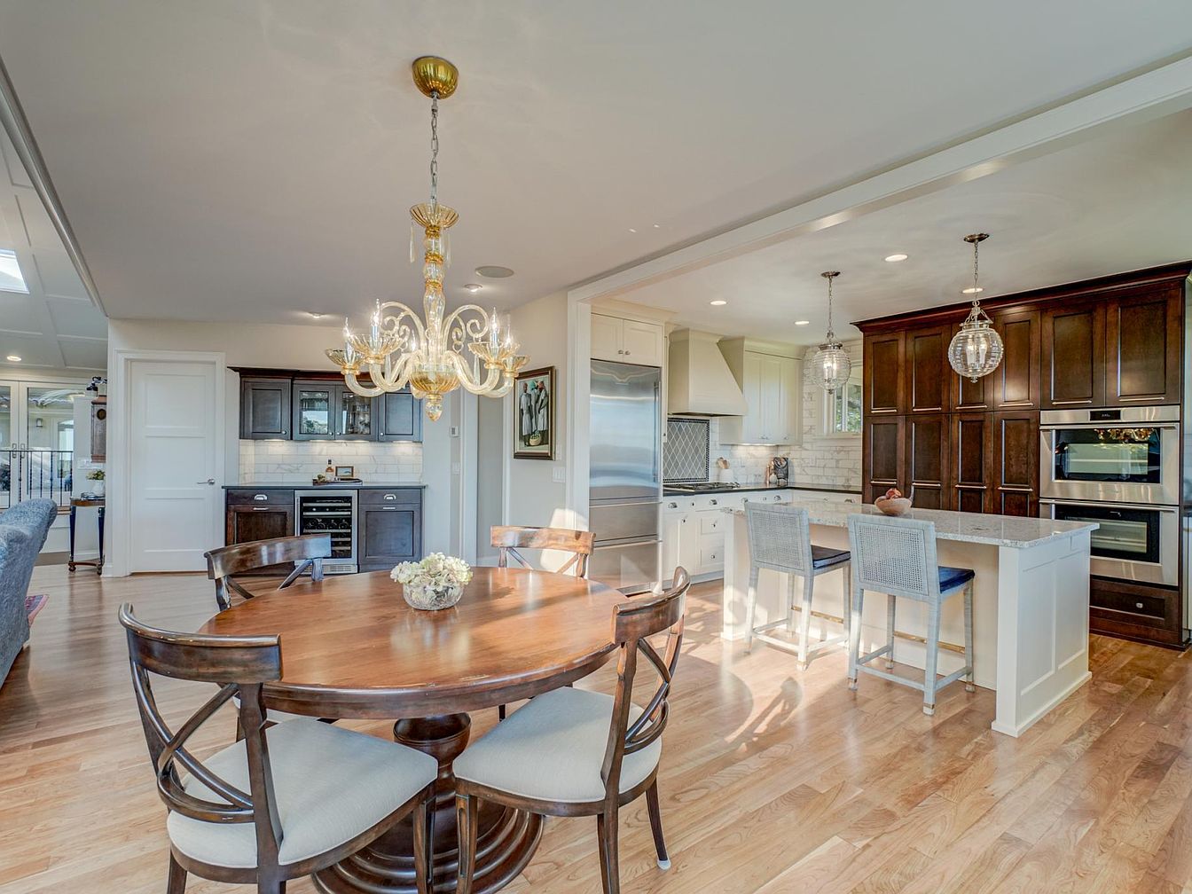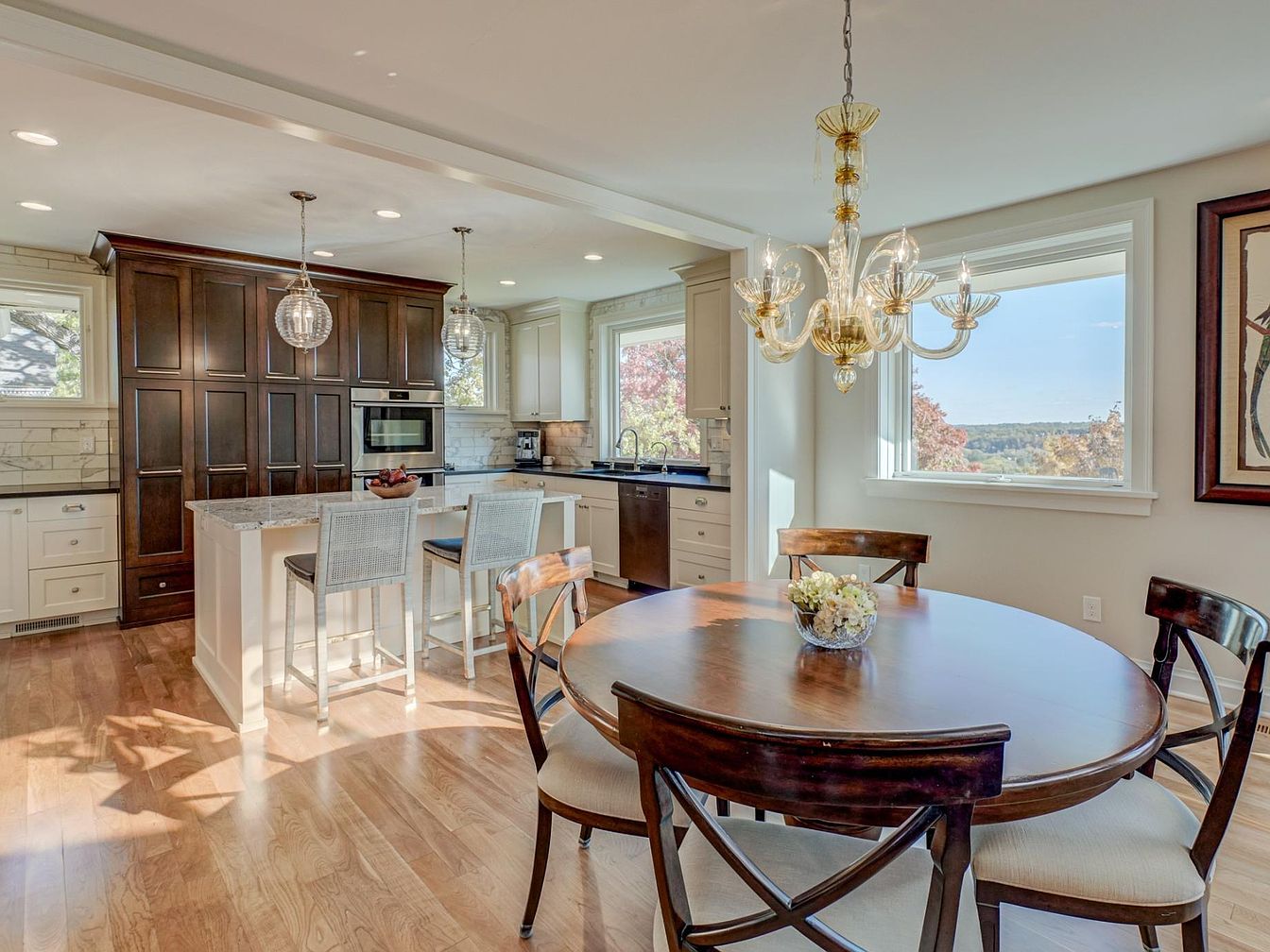 The kitchen features a spacious, open layout with a seamless flow to the dining area. Dark wood cabinetry contrasts elegantly with the lighter cabinetry and countertops, creating a warm yet modern feel. A round wooden dining table, surrounded by comfortable upholstered chairs, invites conversation. Above, a stunning chandelier adds elegance, complemented by pendant lights over the kitchen island, which has bar seating. Natural light floods the space through a nearby window, highlighting the hardwood flooring and subtle tile backsplash. Stainless steel appliances enhance the contemporary aesthetic, while decorative elements add a personal touch.