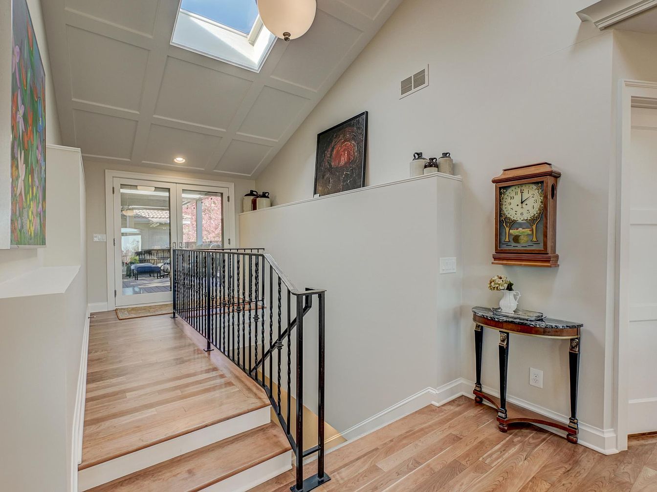 A spacious entryway features soft gray walls adorned with contemporary art and a rustic wooden floor. Natural light floods the space through a skylight, enhancing the airy feel. The elegant staircase boasts a black wrought-iron railing, leading to the upper level. At the base, a decorative console table with a marble top is complemented by a vintage clock, adding a touch of nostalgia. Opposite, large double doors with glass panels open to a patio area, framed by a lush landscape. The overall ambiance combines modern touches with traditional elements, inviting warmth and sophistication.