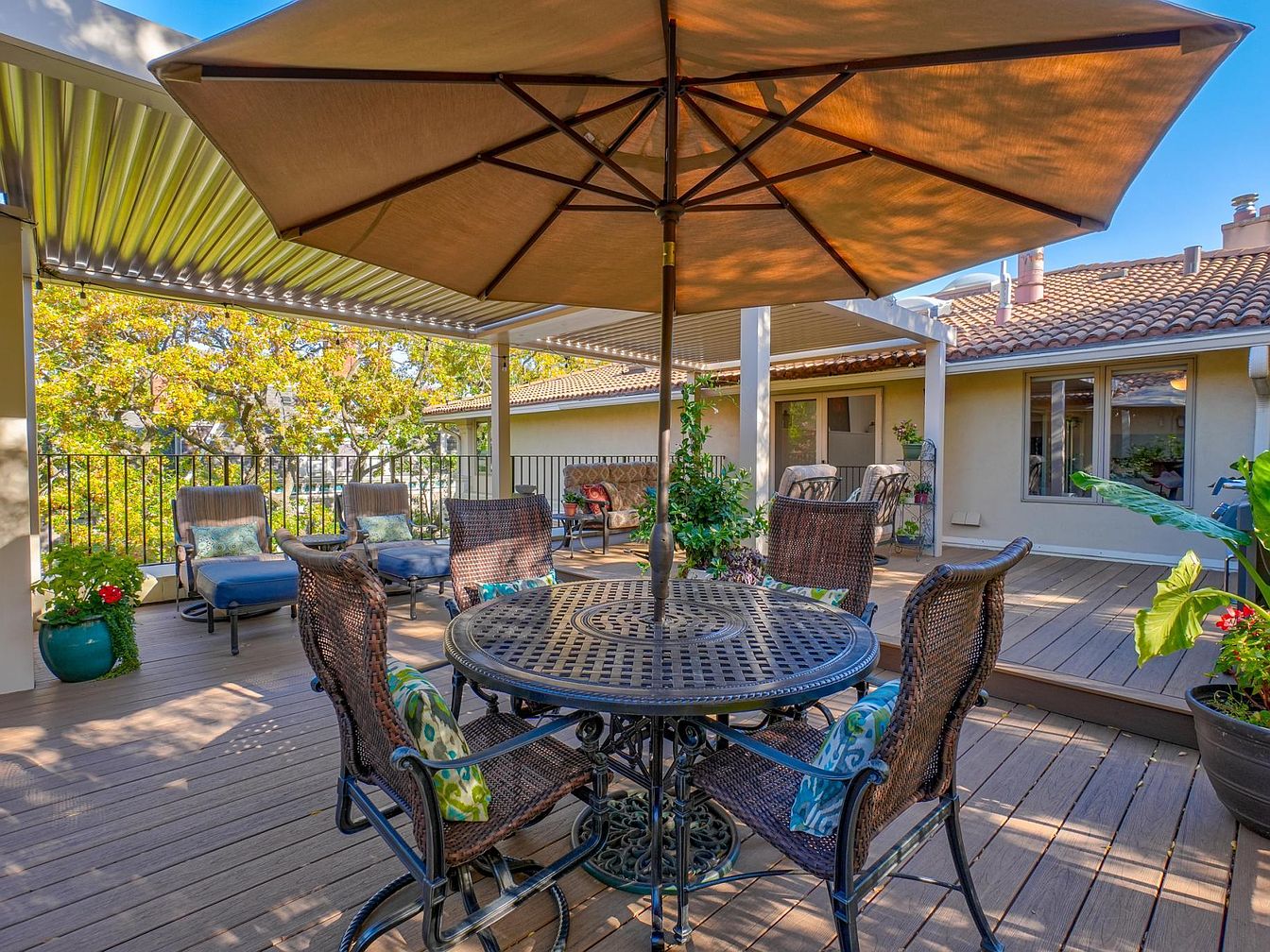 A spacious outdoor patio featuring a round metal table surrounded by stylish wicker chairs. An inviting large umbrella provides shade. The floor showcases warm wooden decking, creating a natural feel. Behind, comfortable lounging chairs positioned against a railing overlook greenery, enhancing the space’s outdoor charm. Colorful cushions accentuate the seating, bringing vibrancy. Lush potted plants with flowers add life and color, while the sunlight filters through a nearby pergola, casting playful shadows. Architectural lines demonstrate a harmonious blend of structure and nature, making it an ideal space for relaxation and gatherings.