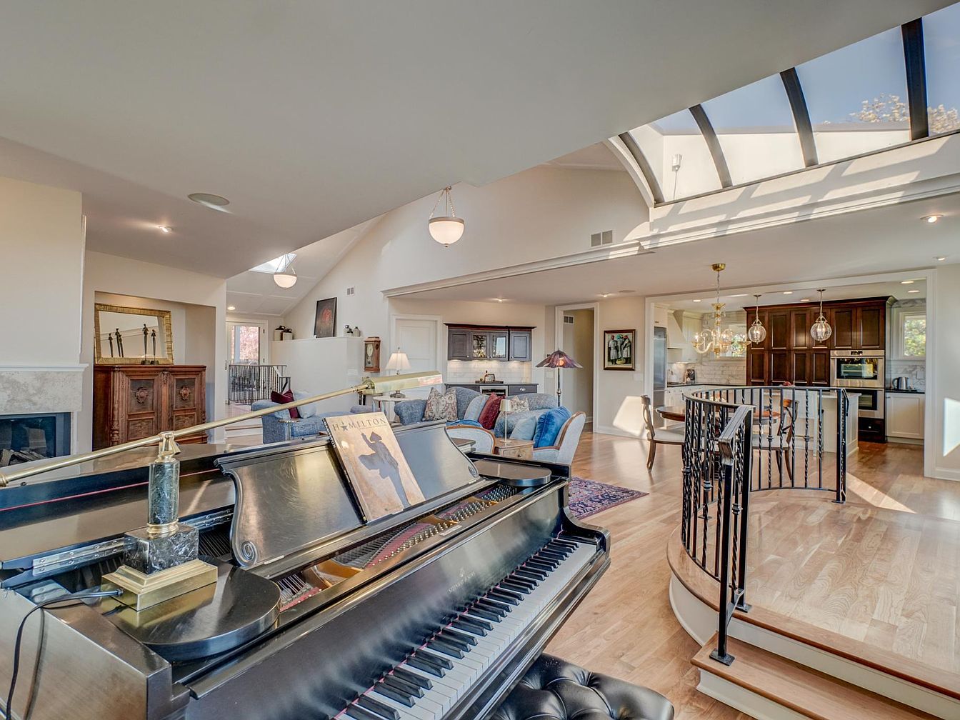 This inviting living room features an elegant grand piano prominently positioned, enhancing the room’s artistic flair. The open layout showcases warm hardwood floors and high ceilings accentuated by modern pendant lighting. Cozy seating arrangements with plush sofas and colorful cushions are thoughtfully placed adjacent to a sparkling fireplace. A dramatic spiral staircase leads towards the kitchen area, framed by sleek iron railings. The color palette consists of soft neutrals, harmonizing with earthy tones from the furniture. Large windows and a skylight allow natural light to flood the space, creating a bright and welcoming atmosphere.