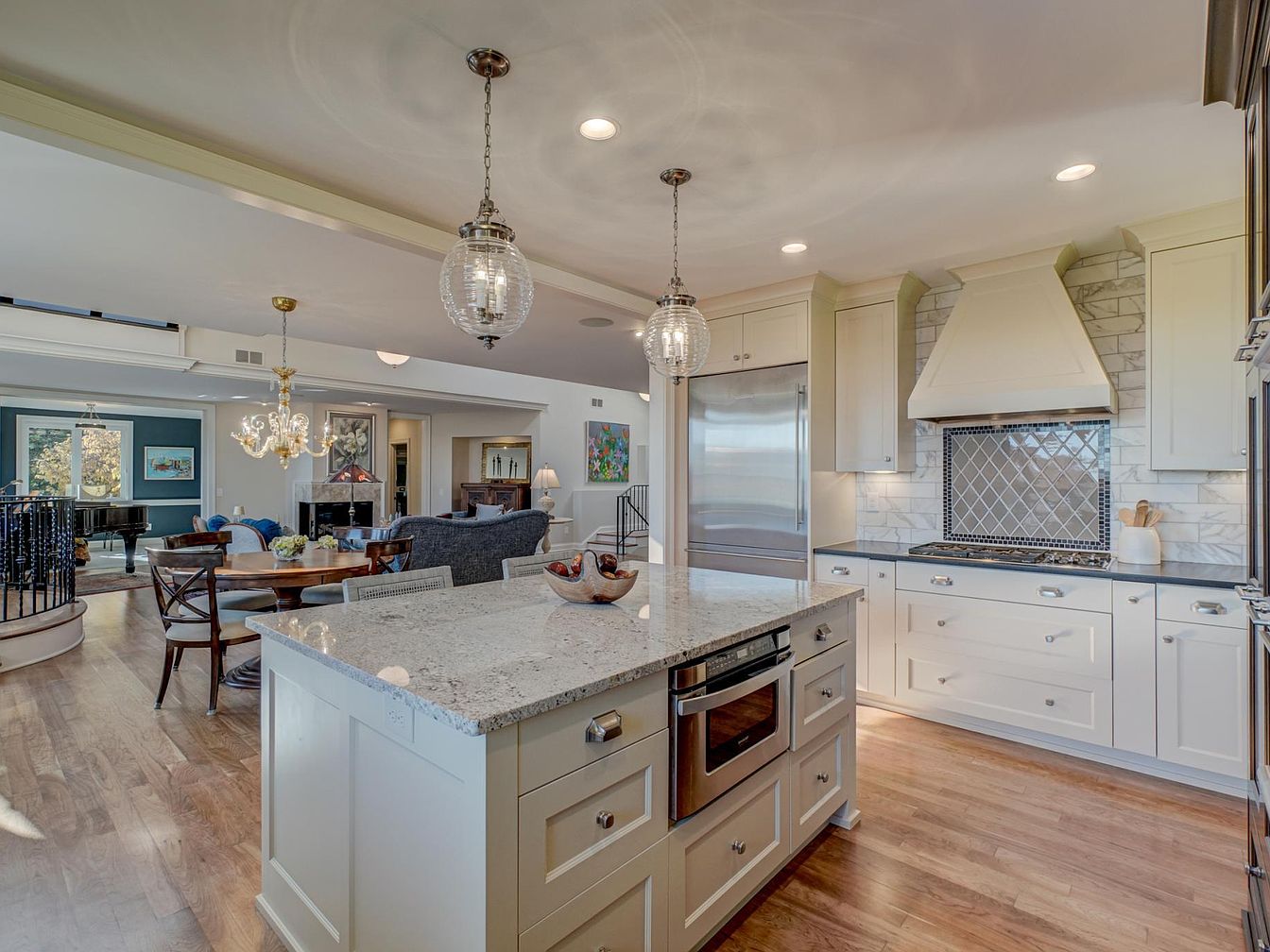 This kitchen showcases a spacious layout with a large central island featuring a light granite countertop. White cabinetry lines the walls, complemented by silver handles, creating a clean aesthetic. A decorative backsplash in a diamond pattern enhances the stove area, while stainless steel appliances add a modern touch. Overhead, elegant glass pendant lights provide warm illumination. The connected dining area, visible in the background, includes wooden chairs and a round table, maintaining a cozy yet sophisticated atmosphere. The open design allows natural light from nearby windows, blending functionality with an inviting ambiance.