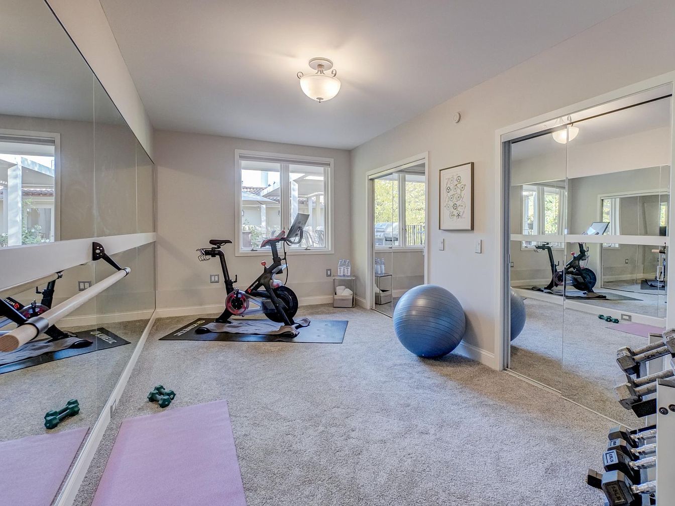 The space serves as a home gym with a soft, neutral color palette that includes light gray walls and plush gray carpeting. A large mirror stretches across one wall, enhancing the sense of openness. To the left, a stationary bike sits on a black mat, complemented by a pink yoga mat on the floor. In the corner, a blue exercise ball adds a pop of color, while a set of dumbbells rests on the floor nearby. Bright natural light filters through large windows, creating an inviting atmosphere conducive to fitness and wellness.