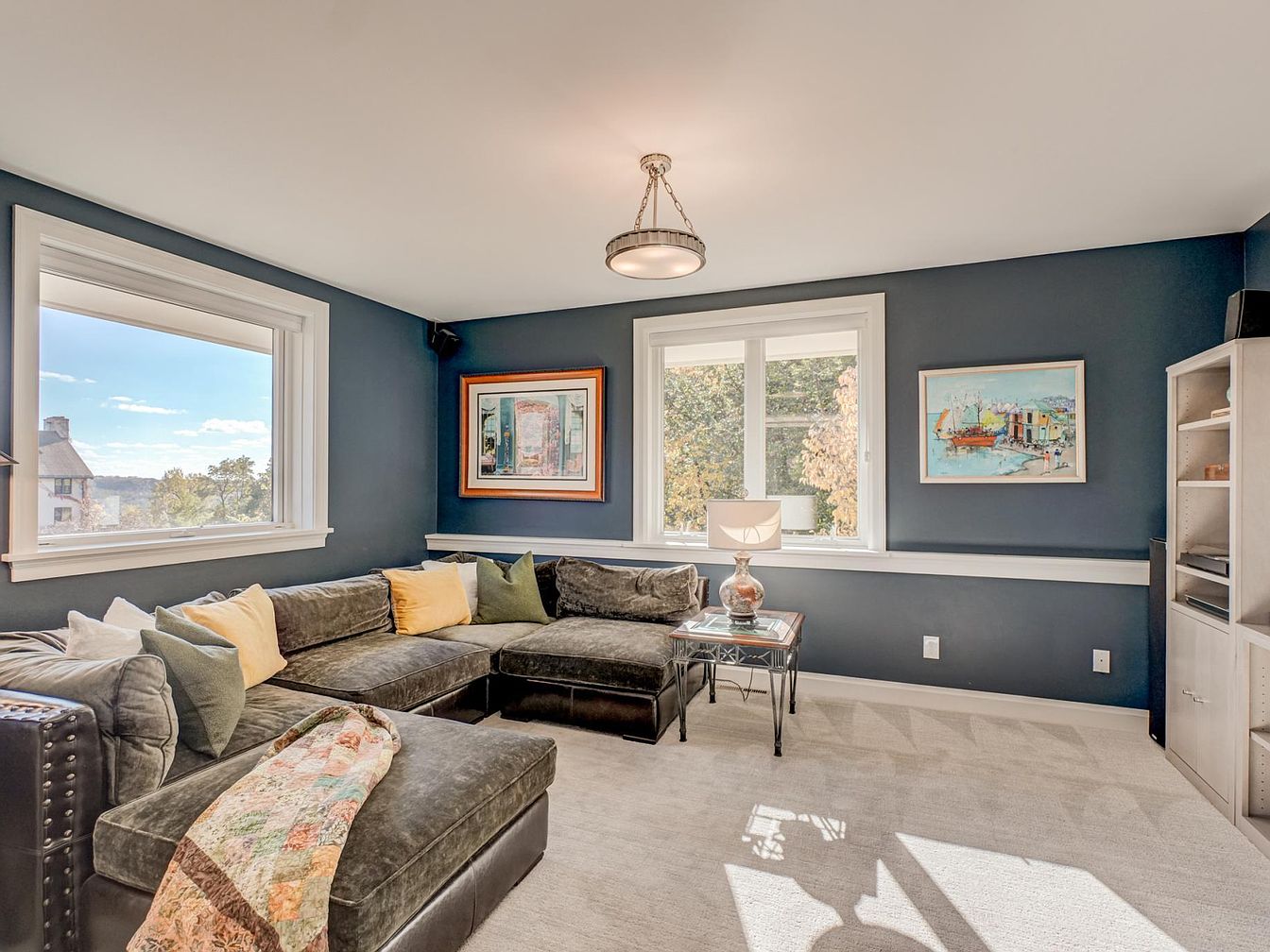 Cozy living room featuring deep blue walls that evoke a sense of tranquility. A spacious sectional sofa dominates the corner, accented with a mix of textured pillows in muted greens and warm yellow tones. A light, airy ambiance is created by ample daylight streaming through two large windows, framed by classic white trim. Artwork adds color to the walls, with a vibrant painting contrasting against the blue backdrop. A small, elegant side table holds a stylish lamp, casting a soft glow. The carpet and furniture choices combine comfort with modern aesthetics, fostering an inviting atmosphere for relaxation.
