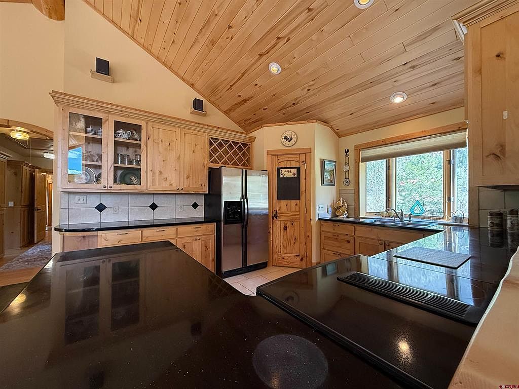 This kitchen features a warm, rustic design highlighted by natural wood cabinetry and a wood-paneled vaulted ceiling, contributing to a cozy, cabin-like atmosphere. The cabinetry is finished in light pine with a visible wood grain, adding texture and charm. Black granite countertops provide a sleek contrast, while a tile backsplash with black diamond accents adds subtle pattern and visual interest. Stainless steel appliances, including a refrigerator and a cooktop embedded in the counter, enhance functionality. Large windows above the sink bring in natural light and offer views outside, creating an inviting and well-lit workspace.