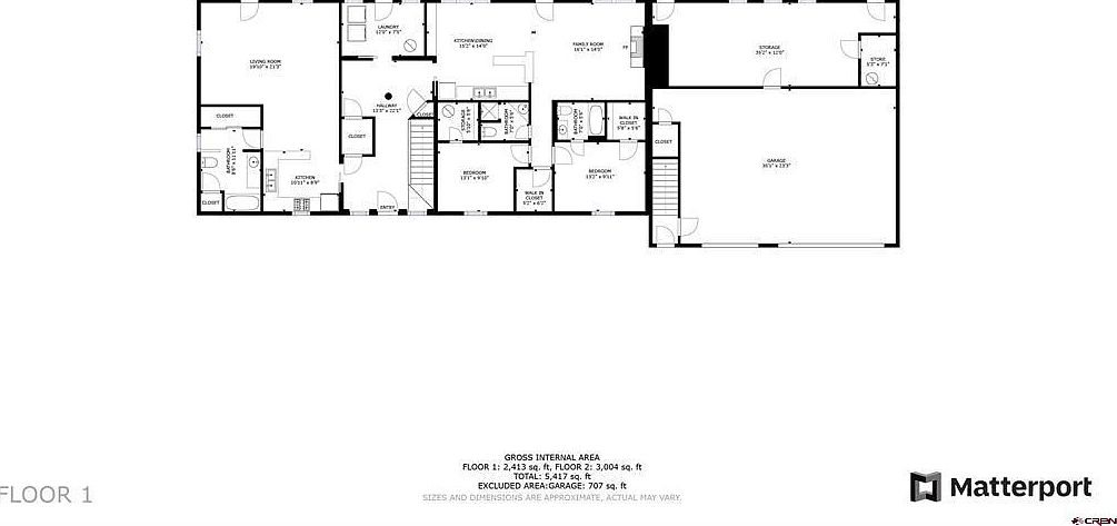 This floor plan outlines the first level of a spacious home, organized into well-defined zones. It includes a large living room, kitchen with adjoining dining space, and a cozy family room. Two bedrooms each feature walk-in closets, complemented by bathrooms equipped for convenience. A dedicated laundry area near the kitchen enhances functionality. The design incorporates extensive storage spaces and closets, emphasizing practicality. A large garage and adjoining storage rooms occupy one side, ideal for vehicles and additional household storage. Overall, the layout balances communal living areas with private spaces, facilitating comfortable living and efficient flow.