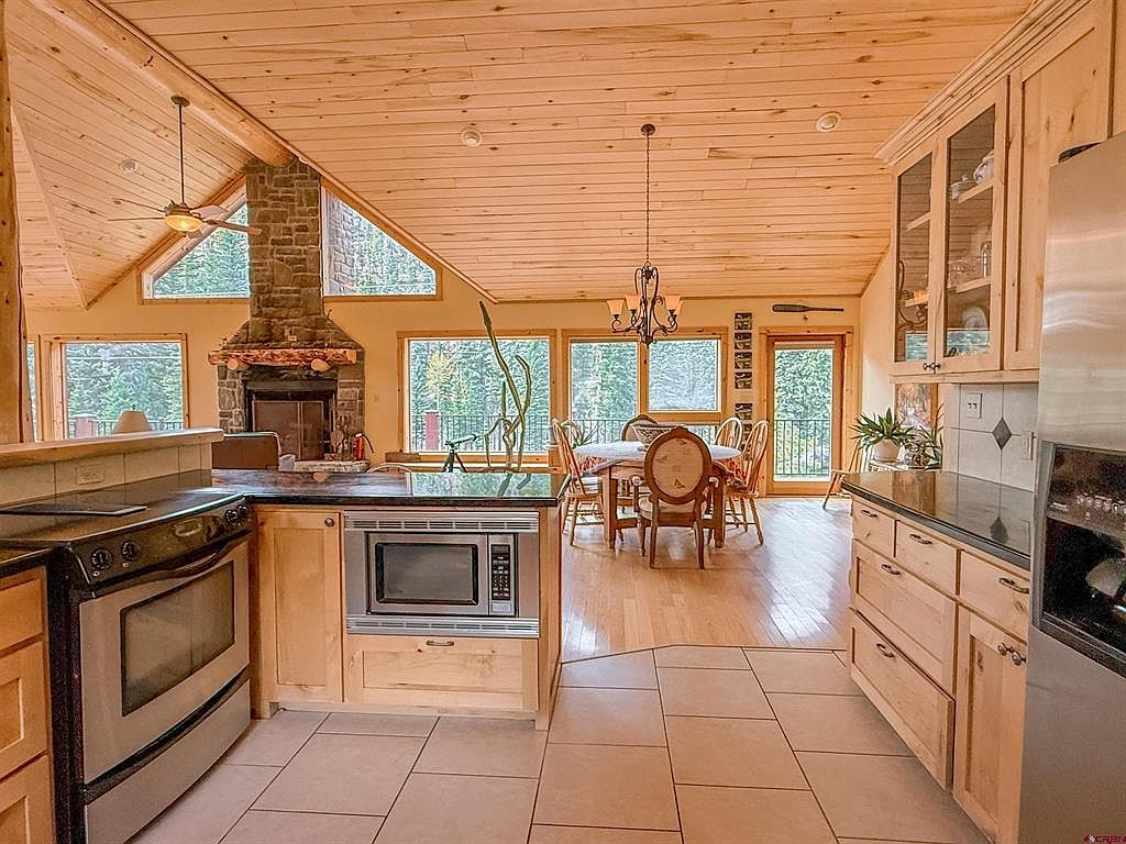 This warm and inviting open kitchen flows seamlessly into the dining area, showcasing natural wood finishes throughout the ceiling, cabinets, and flooring. Light wood tones create a cozy cabin-like ambiance, further enhanced by the stone fireplace visible in the living space. The kitchen features modern black and stainless steel appliances including a stove, microwave, and refrigerator, complemented by granite countertops. Large windows in the dining area bring in abundant natural light and offer serene forest views. The space balances rustic charm with functional design, highlighted by a black wrought-iron chandelier above the round dining table and comfortable wooden chairs.