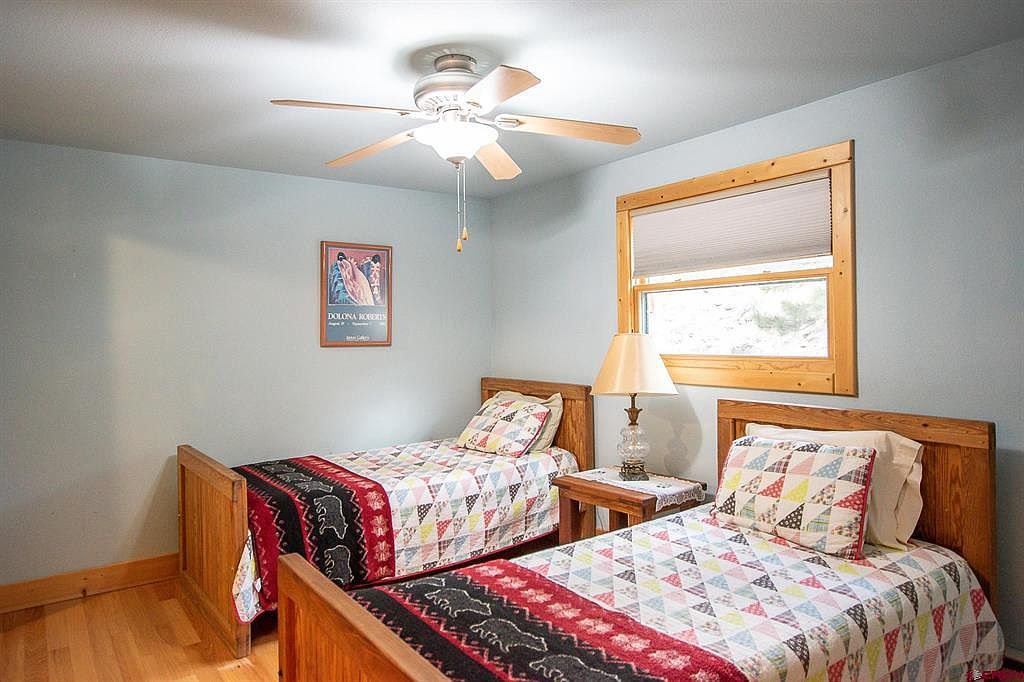 This inviting loft bedroom combines rustic charm and comfort through abundant wooden accents and warm natural light. The space features honey-toned hardwood floors that complement the light sage green walls, framed with natural wooden trim. Two beds—a single daybed with a blue and white star quilt and a larger bed with a vintage-style patchwork quilt—are arranged to maximize the room’s cozy footprint. Large windows, including two square ones and a row of clerestory windows near the ceiling, usher in ample sunlight, highlighting the room’s airy vaulted ceiling with exposed wood beams and a ceiling fan. Simple wall art and a corner nightstand with a red lamp add subtle personal touches, creating a welcoming and peaceful retreat with mountain views.