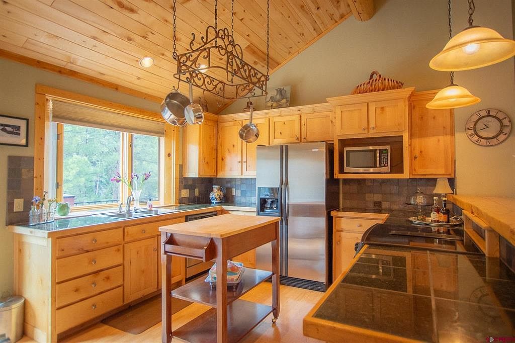 This kitchen features a warm, rustic design with natural wood cabinetry and ceilings, enhancing a cozy cabin-like atmosphere. The vaulted ceiling and exposed wooden beams add architectural interest, while multiple stainless steel appliances provide modern convenience. A large window above the sink invites natural light and offers scenic outdoor views, brightening the room. The kitchen island on wheels, with shelves and a butcher block top, offers extra workspace and storage. Black tile countertops and backsplash contrast subtly with the wood tones, while hanging pots from an elegant wrought-iron rack add a charming, functional detail.