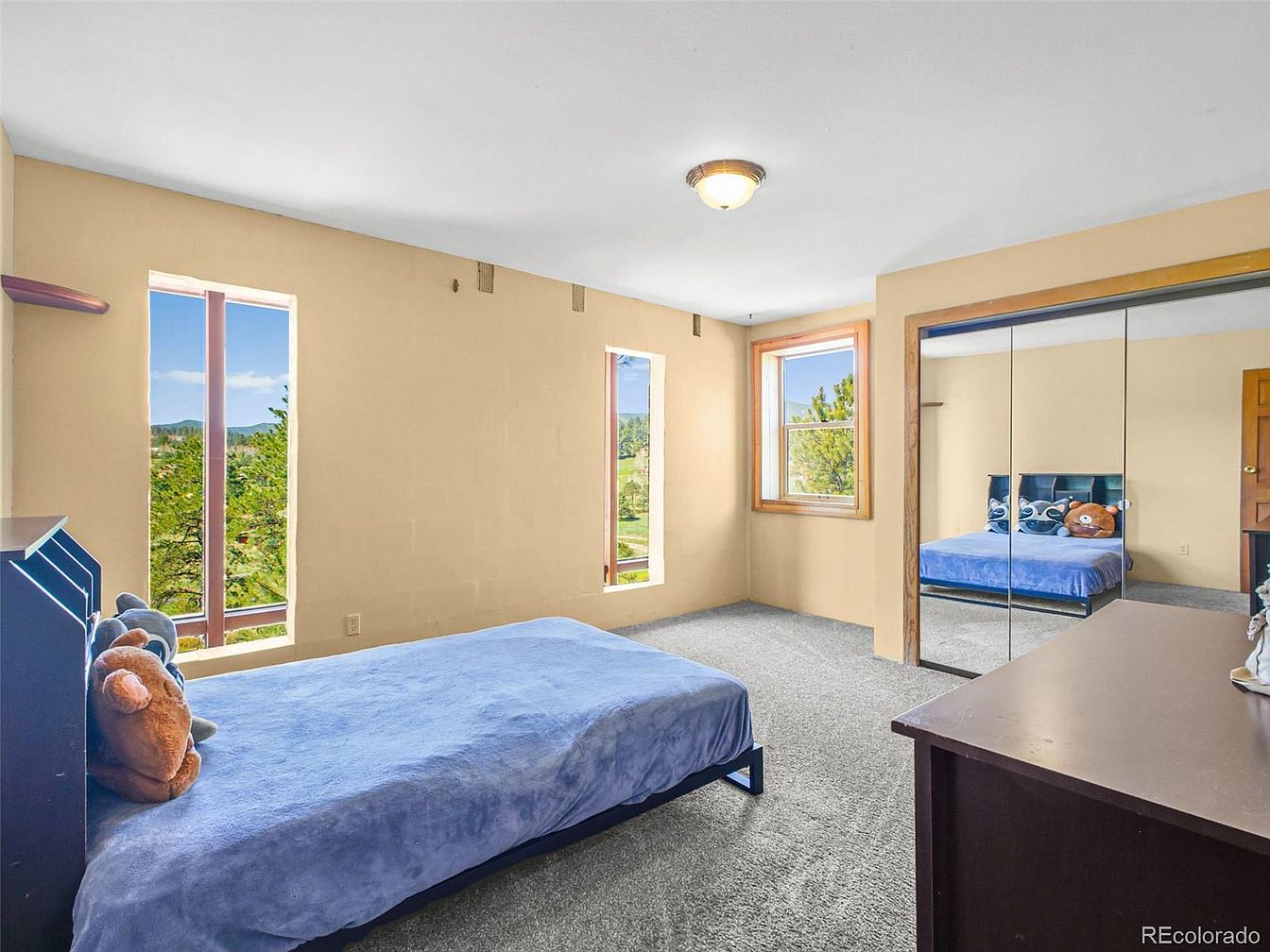 This intimate bedroom features soft beige walls and a plush gray carpet creating a warm and inviting atmosphere. A simple bed with a blue cover and stuffed animals rests against one wall, highlighting a comfortable and personal space. The room is illuminated by natural light streaming through three windows: two vertical rectangular panes and one traditional square window framed with natural wood. A dark wood dresser adds contrast and storage, while mirrored closet doors reflect the room, amplifying its spacious feel. The overall design is minimalist with a cozy, homey appeal and scenic outdoor views.